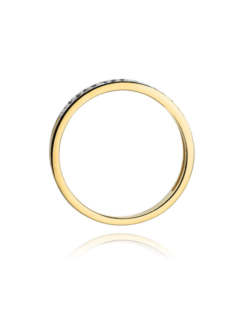 Delikatny pierścionek z żółtego złota z pełną blasku szyną wysadzoną czarnymi brylantami.