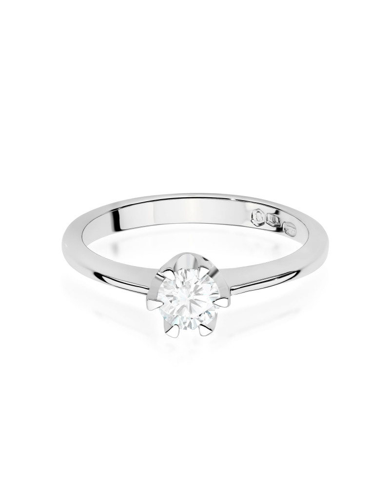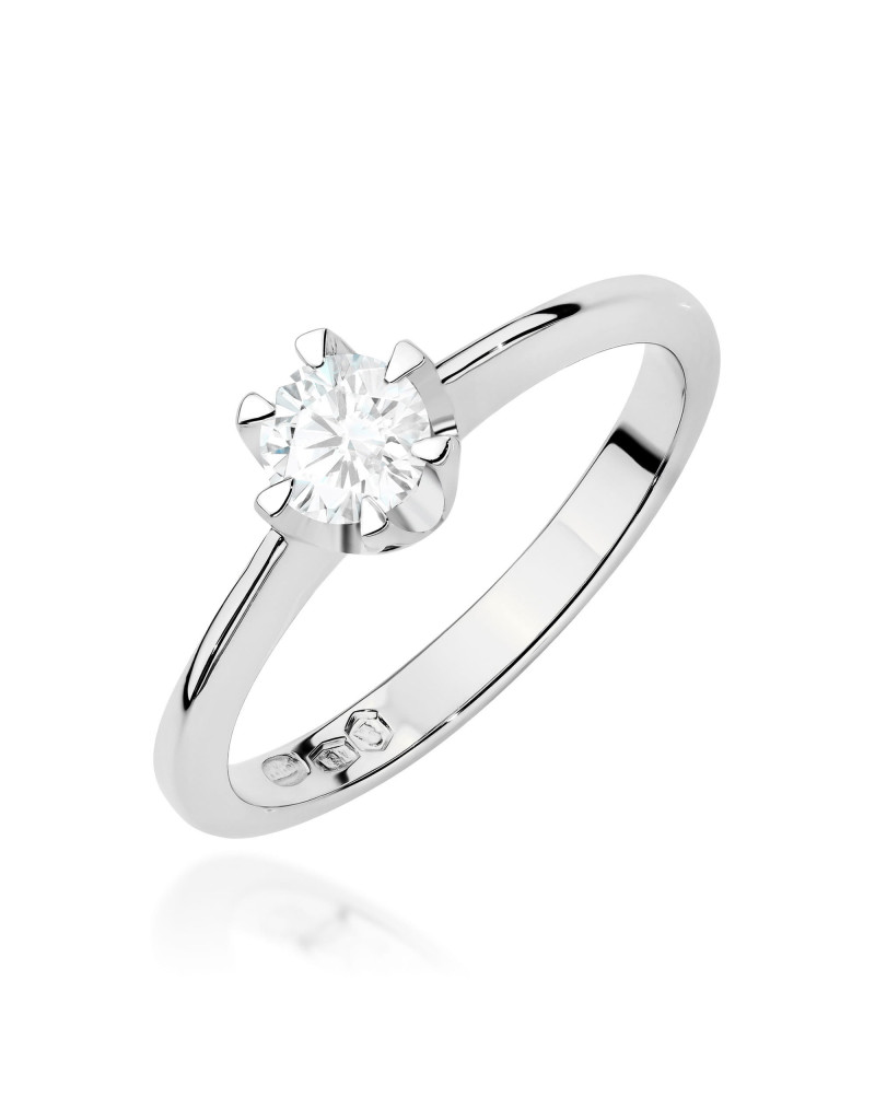 Luksusowy pierścionek wykonany z białego złota z przepięknym brylantem laboratoryjnym w sześcioramiennej koronie z białego złota, pełnej blasku i lśnienia.