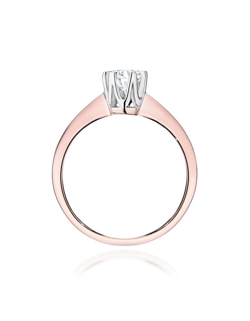Luksusowy pierścionek wykonany z różowego złota z przepięknym brylantem laboratoryjnym w sześcioramiennej koronie z białego złota, pełnej blasku i lśnienia.
