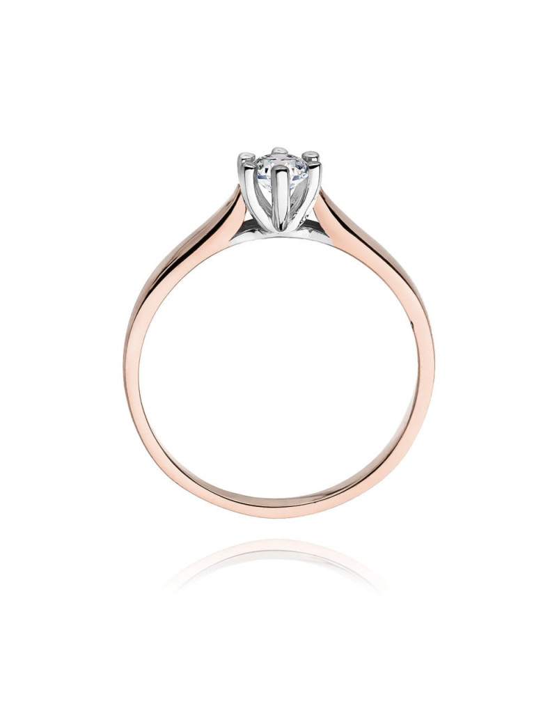 Romantyczny pierścionek z różowego i białego złota w klasycznej oprawie z zachwycającym brylantem laboratoryjnym w sześcioramiennej koronie.