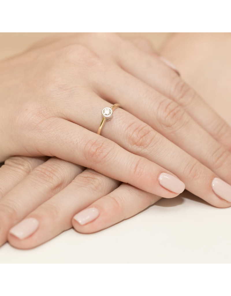 Subtelny pierścionek z żółtego złota z lśniącym brylantem laboratoryjnym w delikatnym kręgu z białego złota.