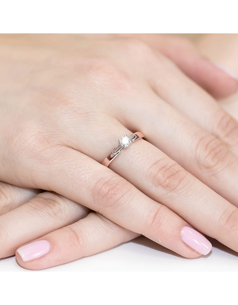 Nietuzinkowy pierścionek z różowego złota z lśniącym brylantem laboratoryjnym elegancko osadzonym w białym złocie.