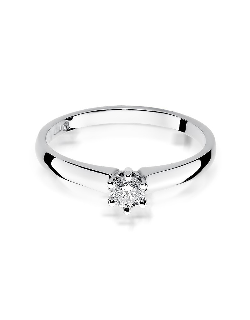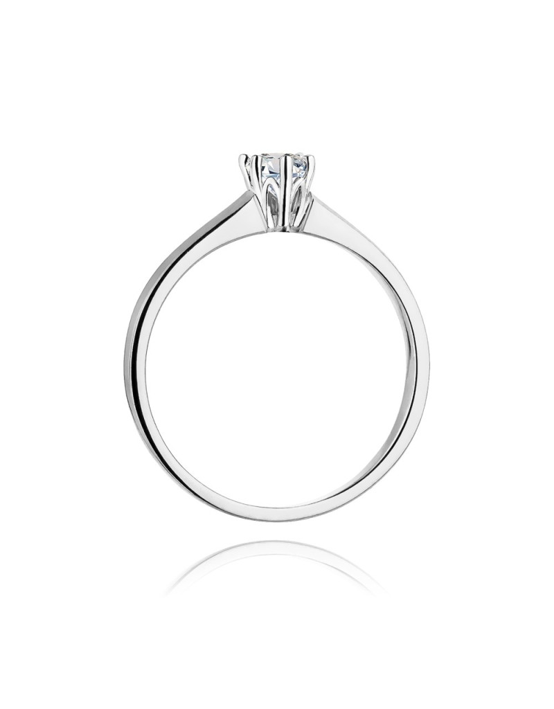 Klasyczny pierścionek z białego złota z urokliwym brylantem laboratoryjnym w sześcioramiennej koronie.