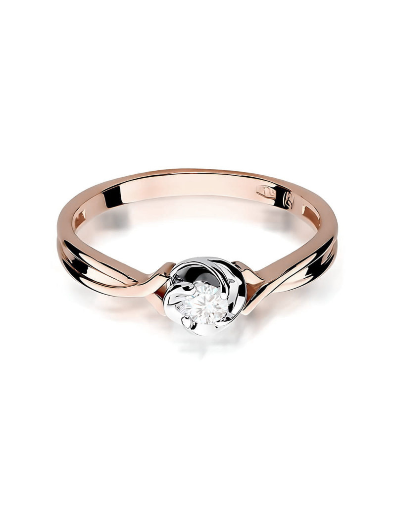 Fantazyjny złoty pierścionek z giętą szyną i lśniącym brylantem laboratoryjnym otulonym subtelną formą z różowego złota.