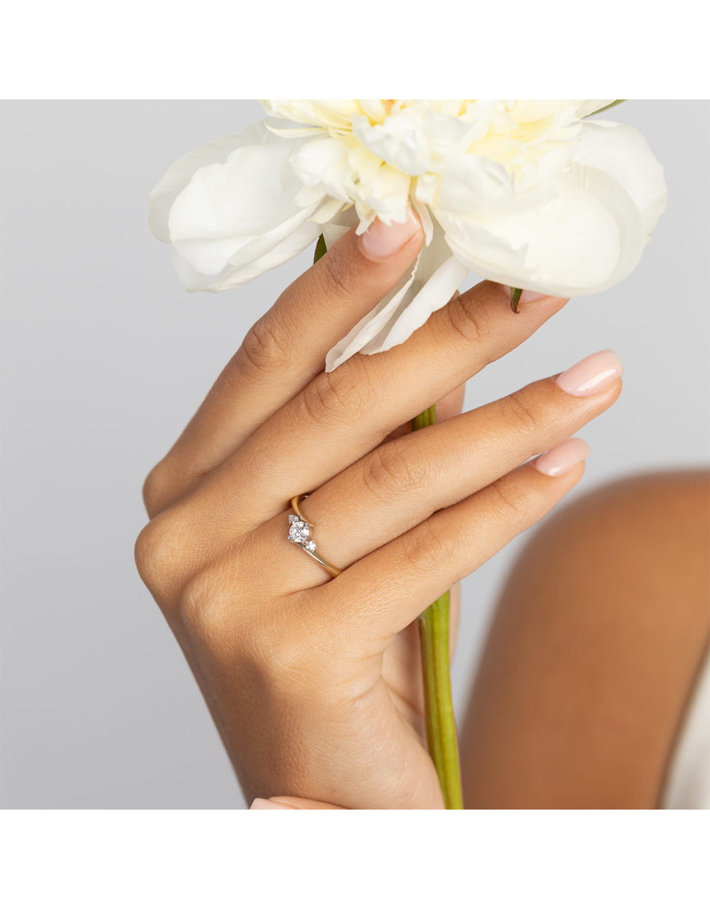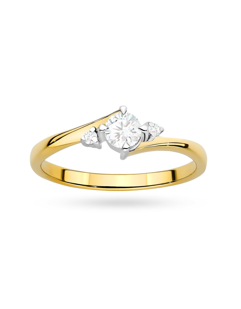 Elegancki i subtelny złoty pierścionek z wygiętą szyną którą ozdabiają olśniewające brylanty laboratoryjne.
