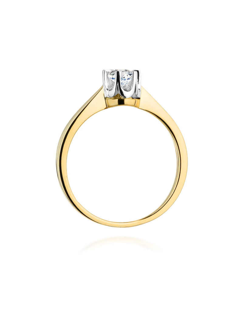 Luksusowy wzór złotego pierścionka z unikatowym brylantem laboratoryjnym w sześcioramiennej koronie. Wykonany z żółtego i białego złota.