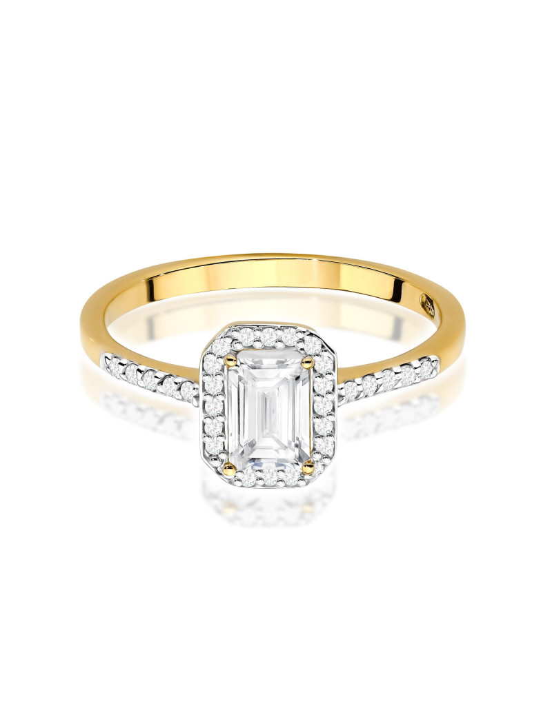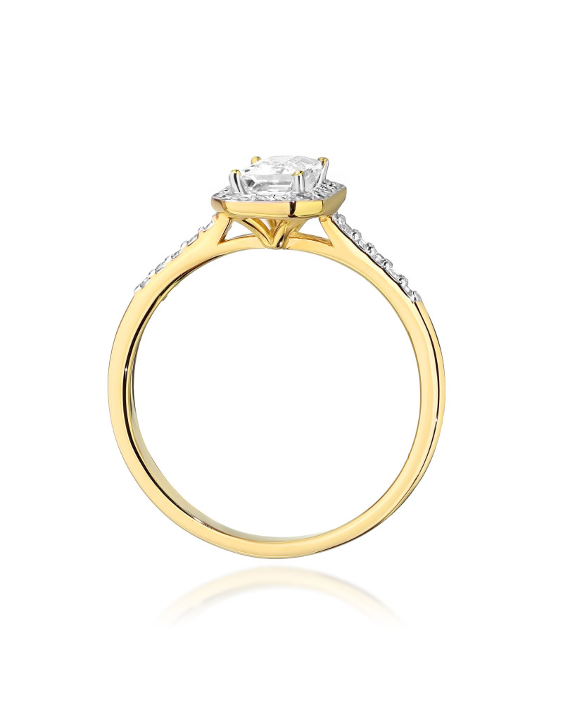 Oryginalny pierścionek z żółtego złota, z fascynującym głównym brylantem laboratoryjnym i towarzyszącymi mu mniejszymi brylantami laboratoryjnymi w oprawie.