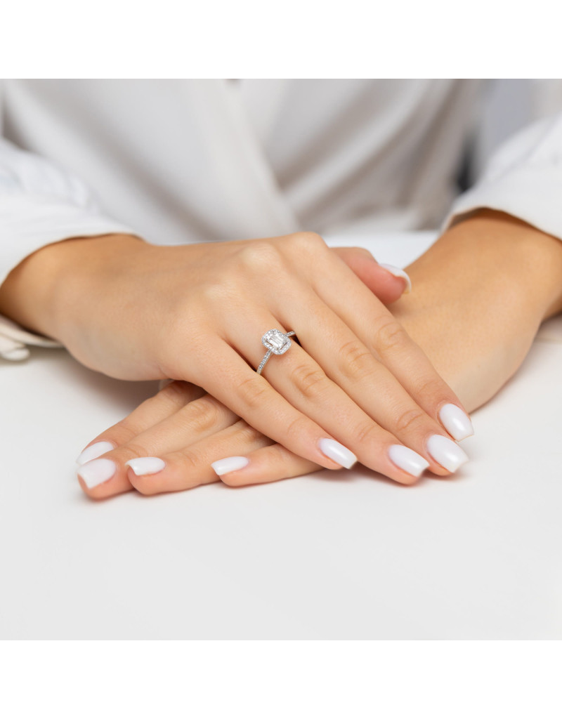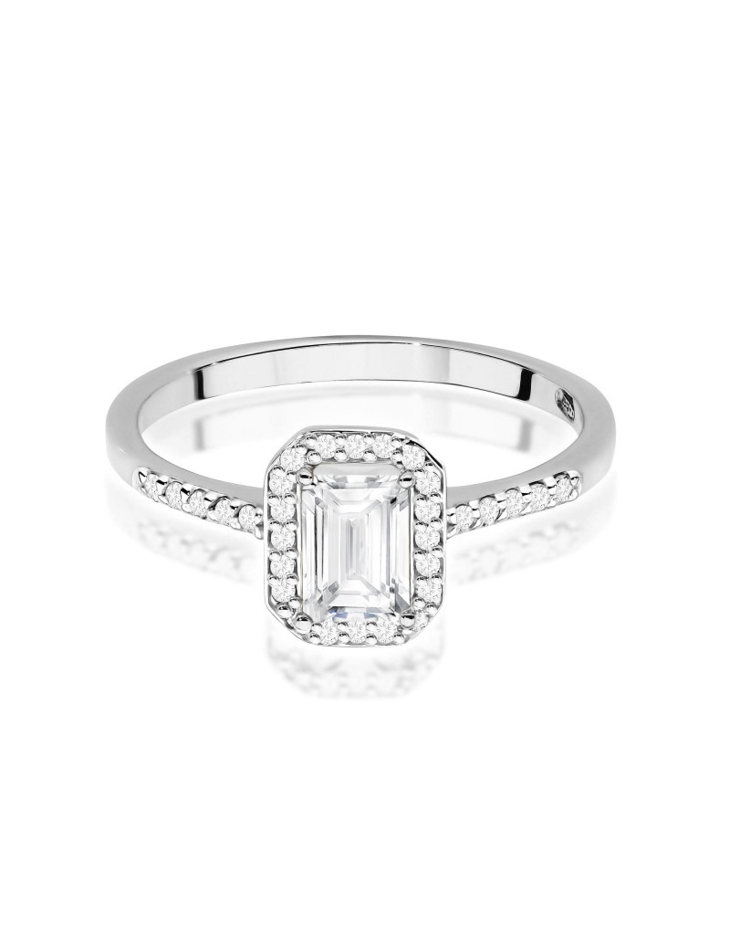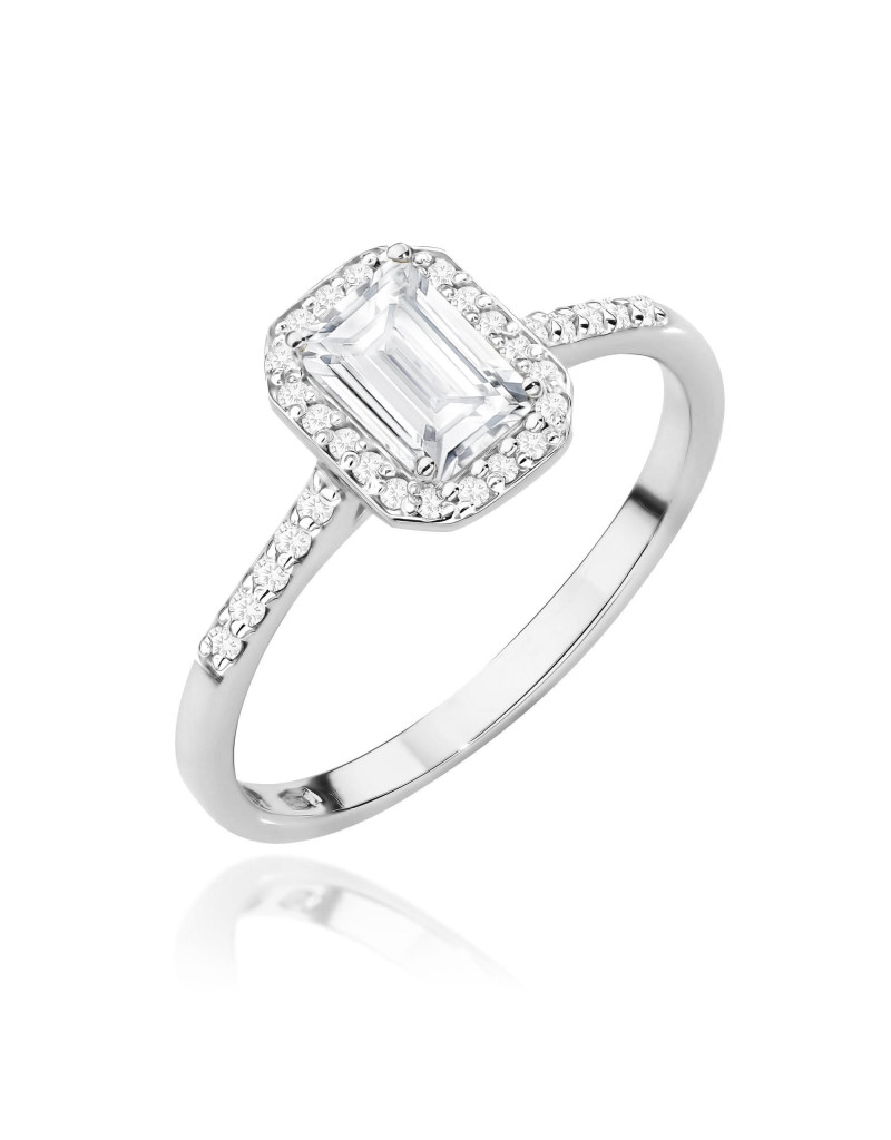 Oryginalny pierścionek z białego złota, z fascynującym głównym brylantem laboratoryjnym i towarzyszącymi mu mniejszymi brylantami laboratoryjnymi w oprawie.