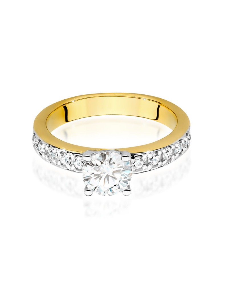 Wyjątkowy pierścionek z olśniewającym brylantem laboratoryjnym w czteroramiennej koronie oraz 12 brylantami na szynie, które dodają mu blasku.