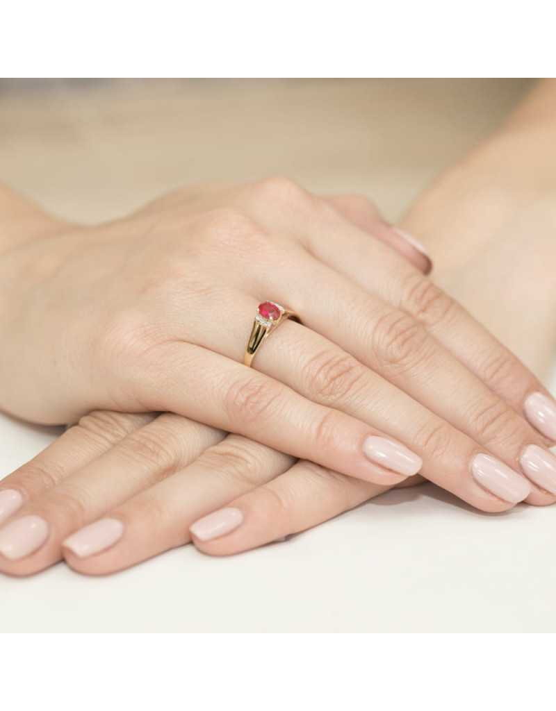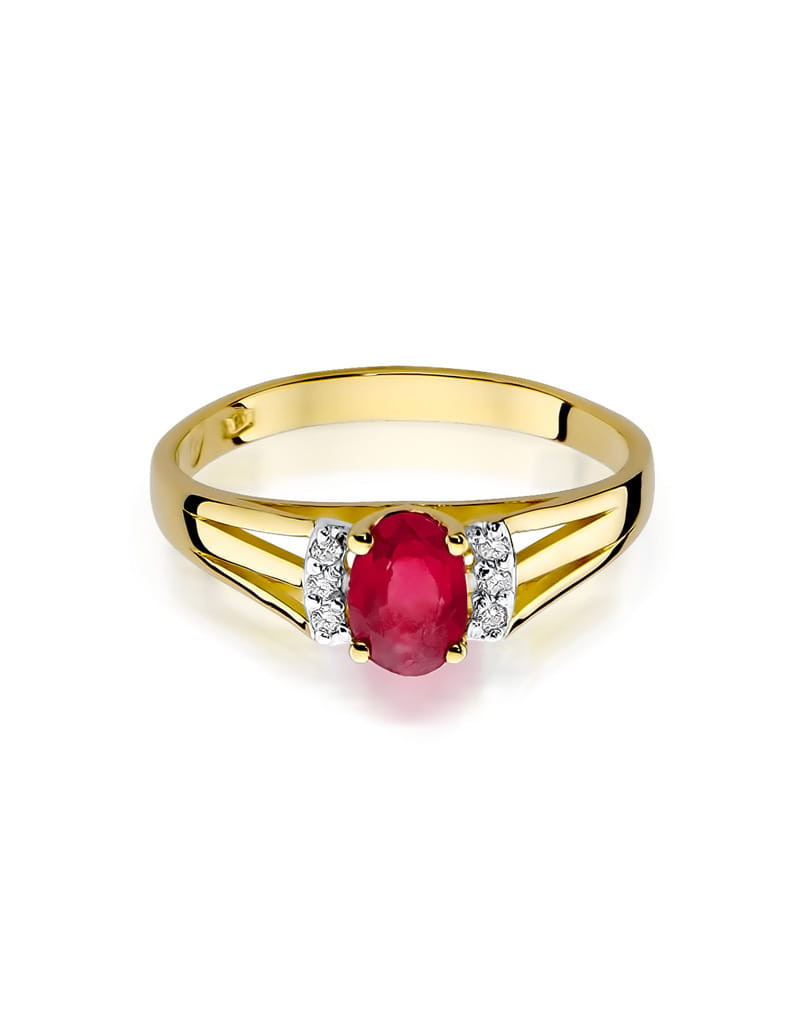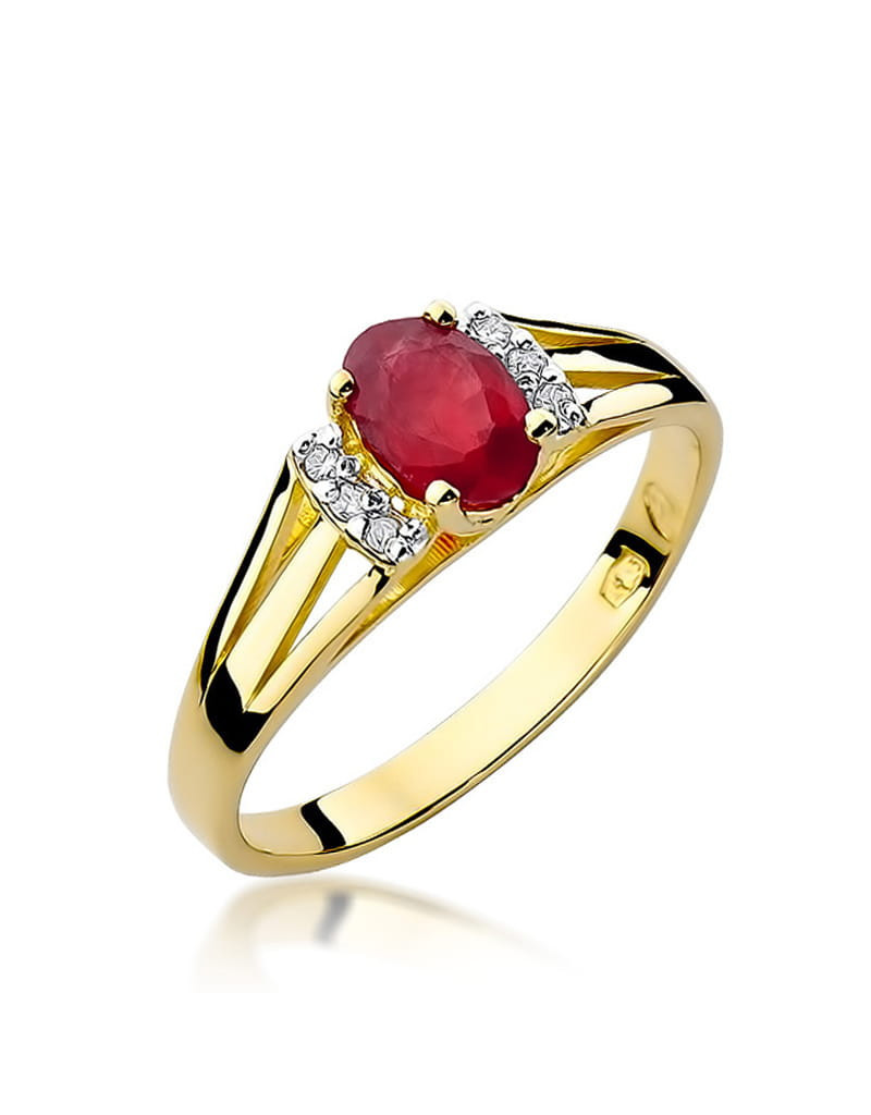 Doskonały wzór pierścionka z sześcioma brylantami, oraz niezwykłym owalnym granatem. Wykonany z żółtego złota.