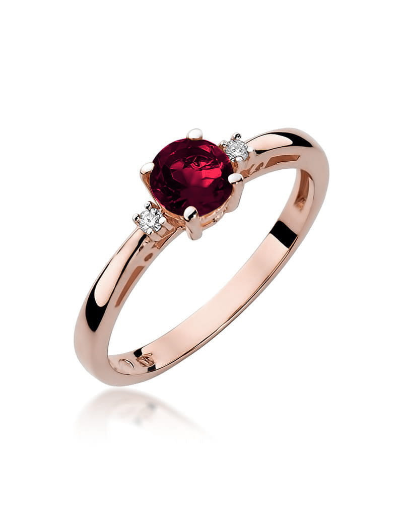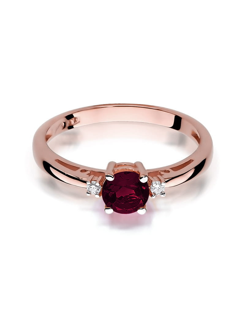 Pełen elegancji i klasyki pierścionek z różowego złota z granatem i 2 brylantami w czteroramiennej koronie.