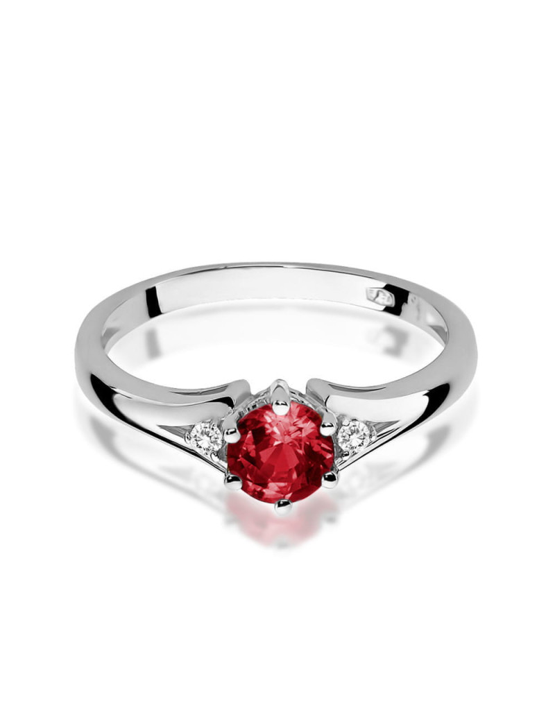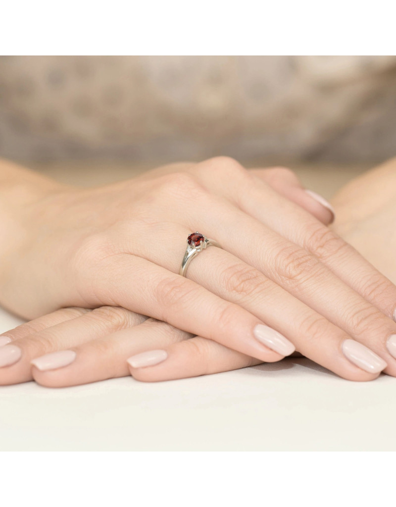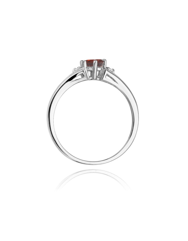 Zjawiskowy pierścionek z białego złota z okrągłym granatem i brylantami.