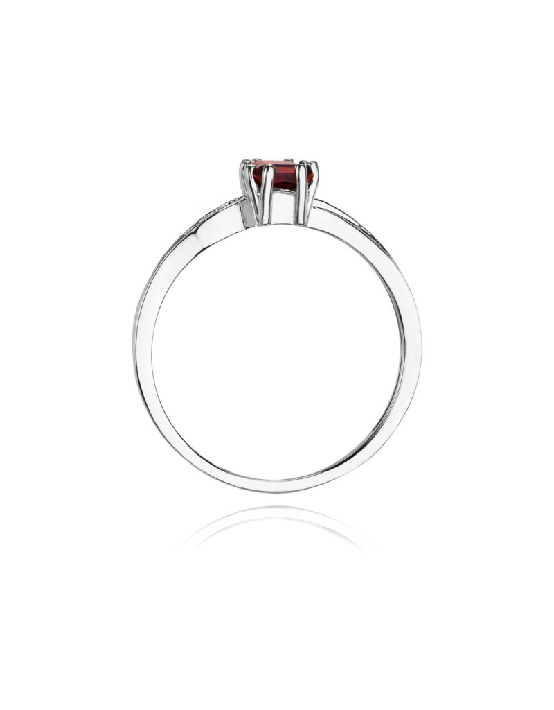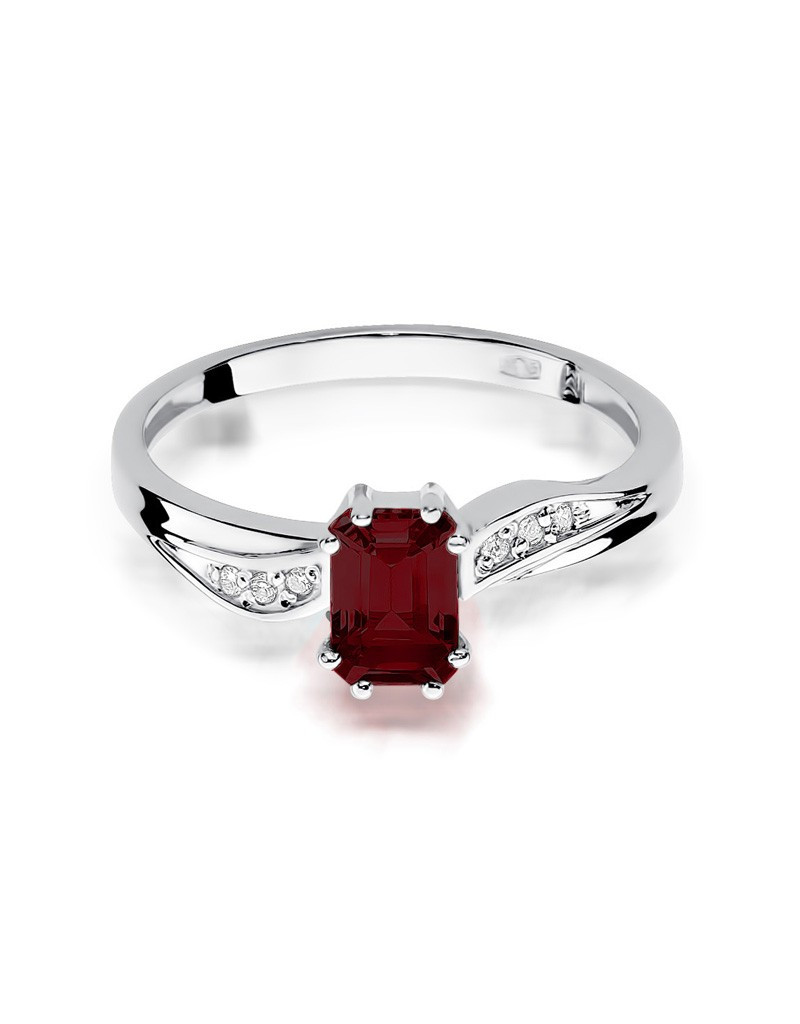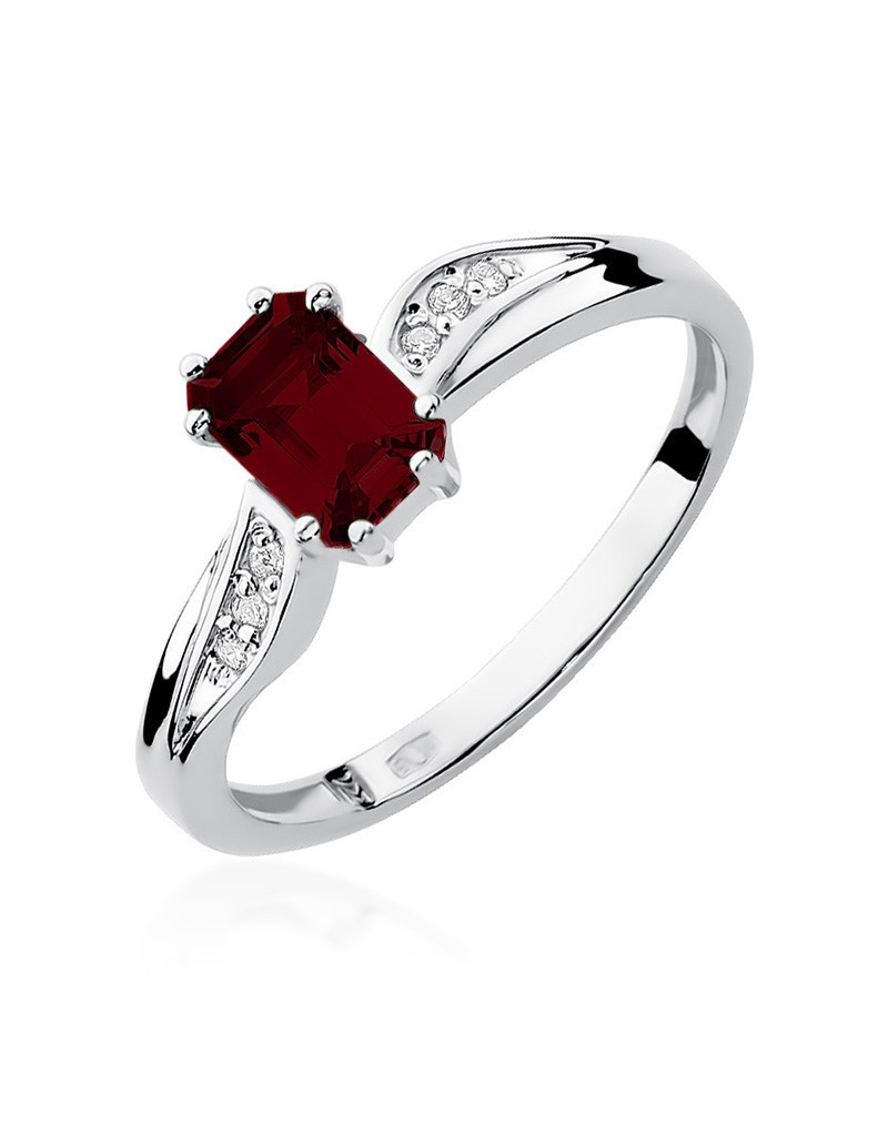 Stylowy pierścionek z białego złota z unikatowym granatem w szlifie szmaragdowym, oraz brylantami w eleganckiej oprawie.