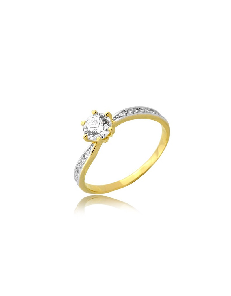 Niezwykły złoty pierścionek o nieprzeciętnym wzorze z duża cyrkonią w koronie i mniejszymi po bokach.