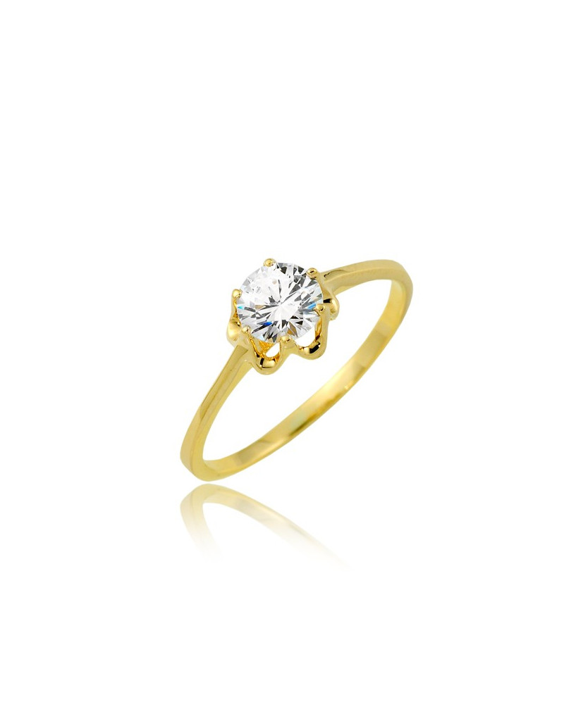 Elegancki złoty pierścionek o unikalnym kształcie korony, zdobiony cyrkonią.