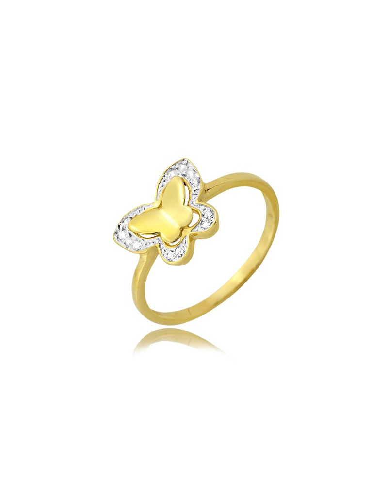 Piękny złoty pierścionek z koroną w kształcie motyla, zdobiony cyrkonią.