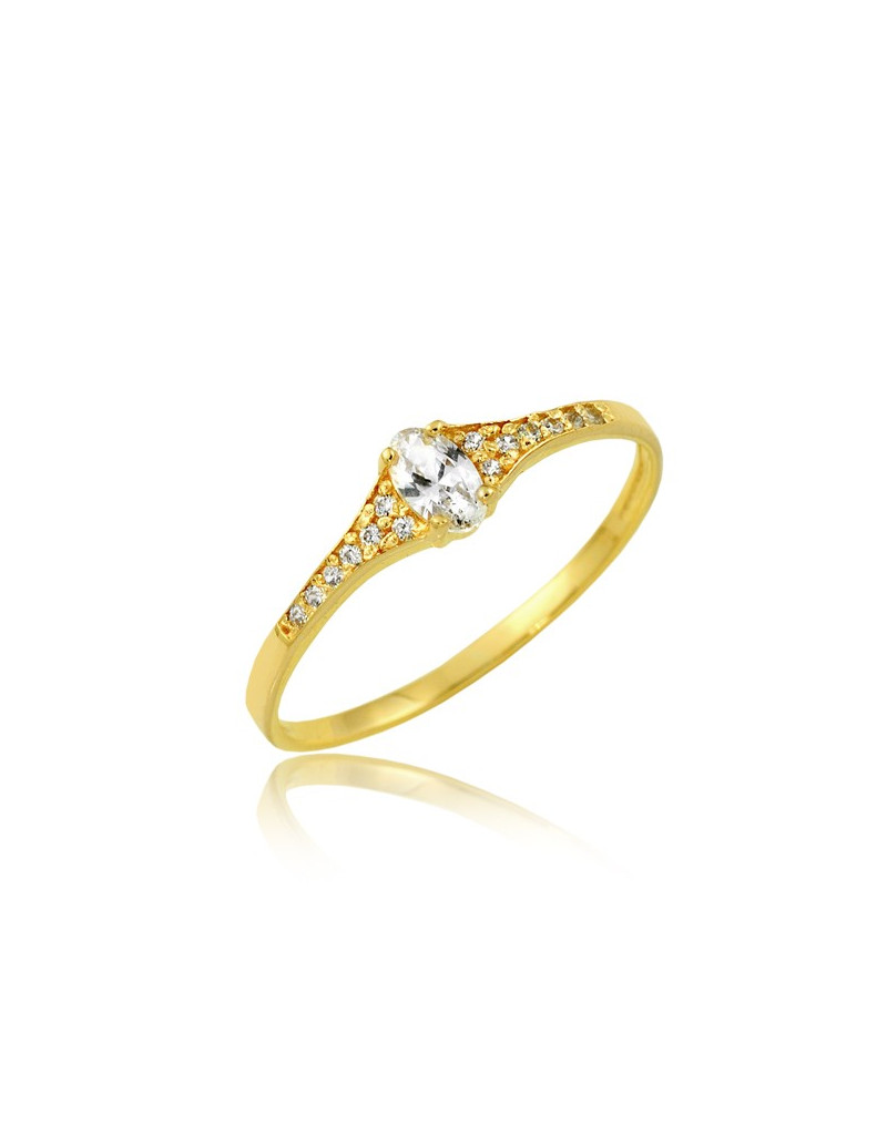 Delikatny złoty pierścionek o klasycznym kształcie, z pięknie wkomponowaną owalną cyrkonią.