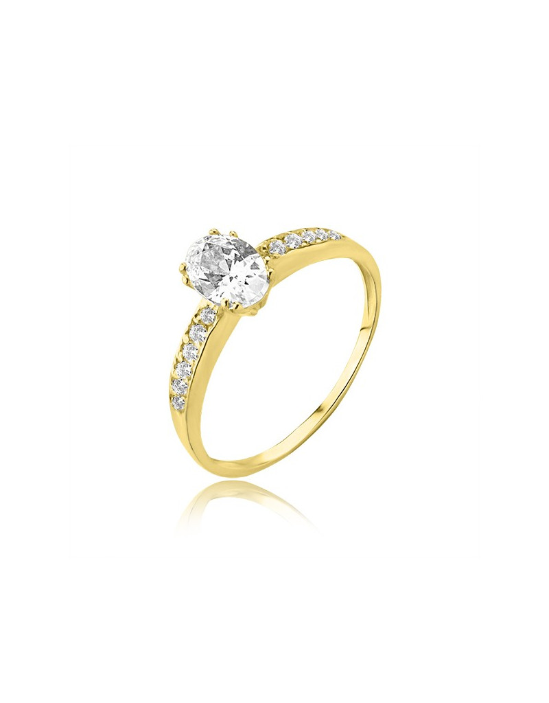 Piękny złoty pierścionek z duża owalną cyrkonią oraz mniejszymi wzdłuż szyny.