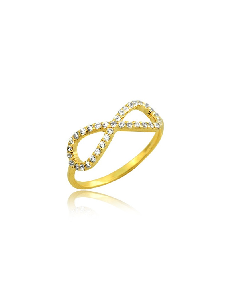 Niezwykły złoty pierścionek z koroną w kształcie znaku nieskończoności, zdobiony cyrkoniami.