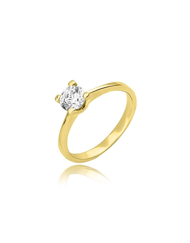 Delikatny złoty pierścionek o klasycznym kształcie, z pięknie wkomponowaną cyrkonią w czteroramiennej koronie.