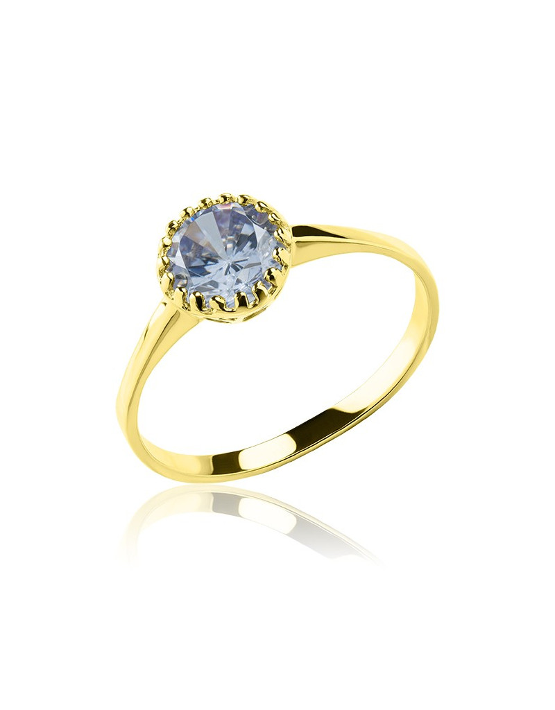 Elegancki złoty pierścionek o unikalnym kształcie korony, zdobiony cyrkoniami.