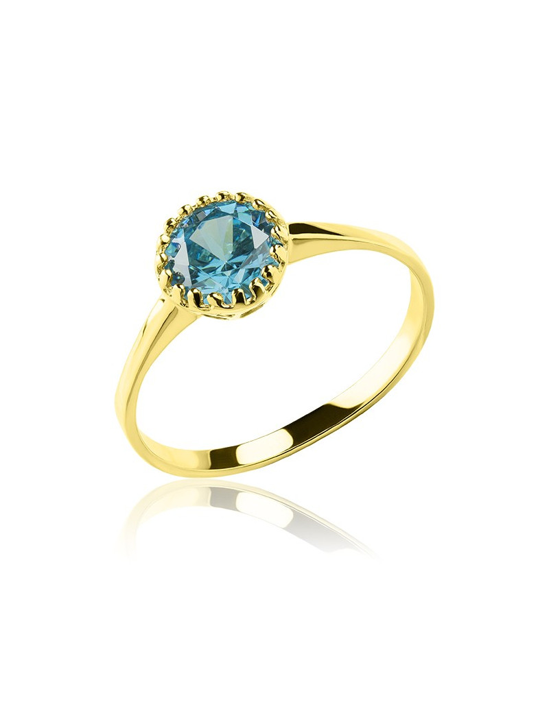 Elegancki złoty pierścionek o unikalnym kształcie korony, zdobiony cyrkoniami.