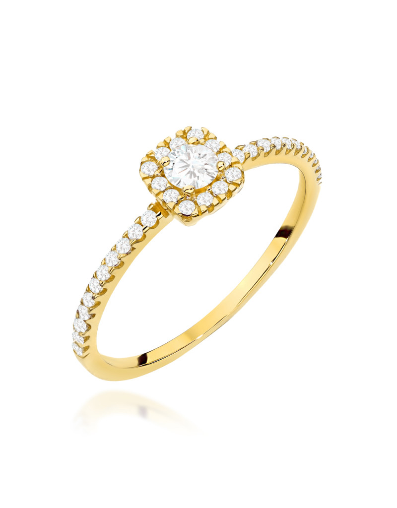 Pierścionek złoty z centralną cyrkonią w kwadracie zdobiony cyrkoniami (Rozmiar pr. 585: 15 Gramatura: 1.41)