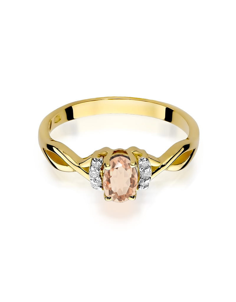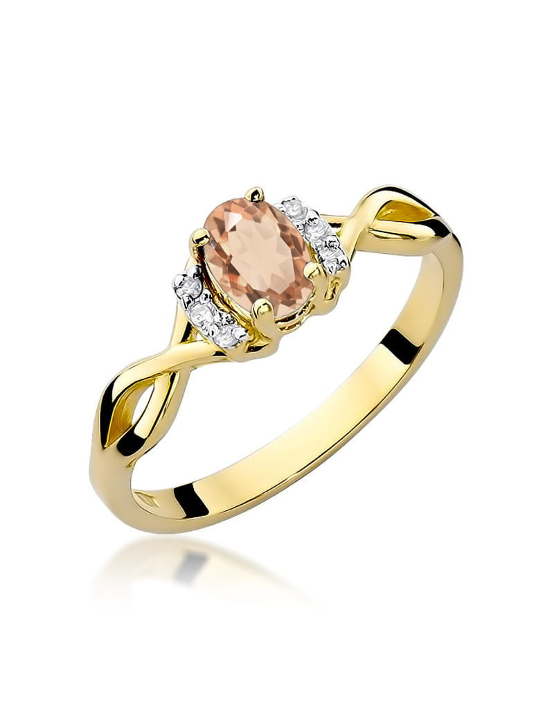 Urzekający wzór pierścionka z żółtego złota z czarującym morganitem i 6 brylantami.
