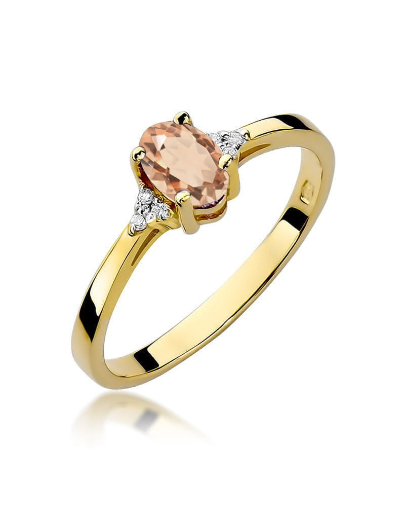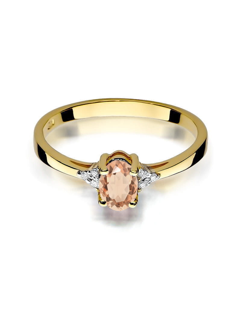 Urzekający pierścionek wykonany z żółtego złota z przepięknym morganitem oraz brylantami, które dodają mu blasku.