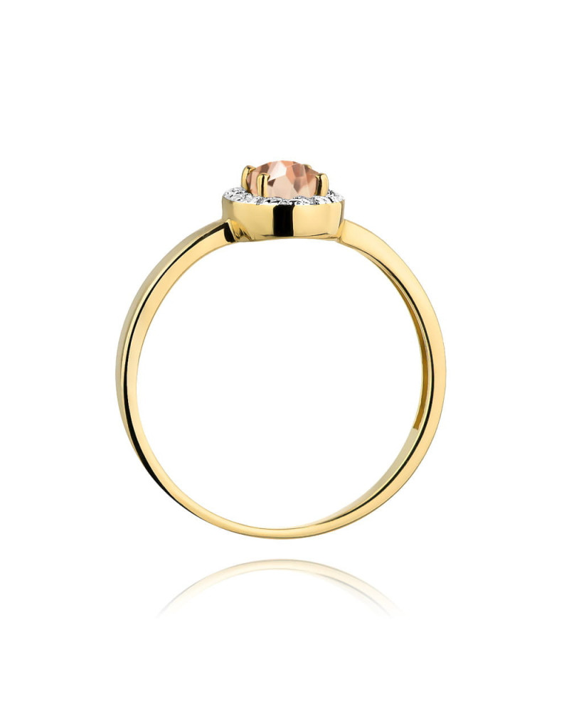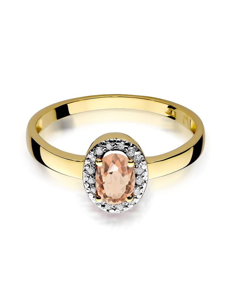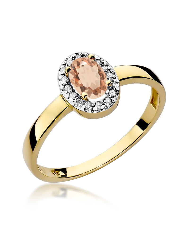 Pełen wdzięku pierścionek z żółtego złota z unikatowym morganitem ozdobionym brylantami w romantycznej oprawie.
