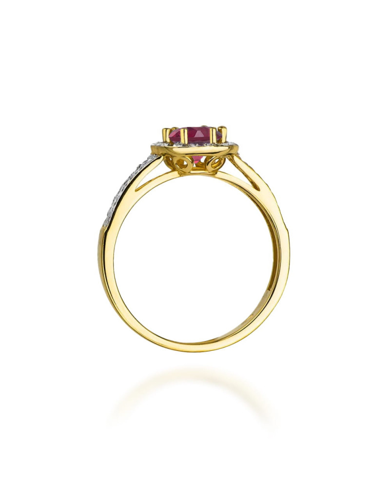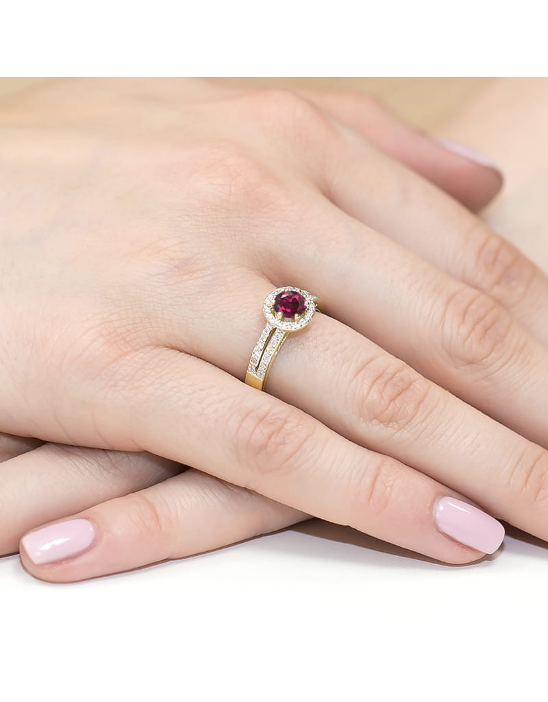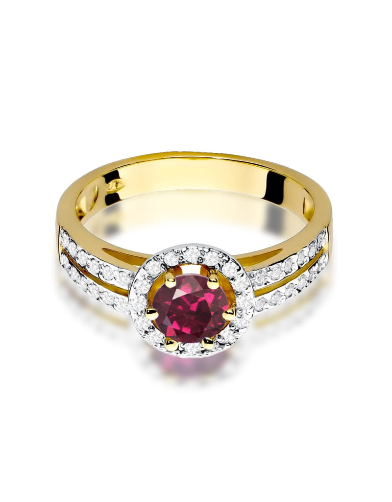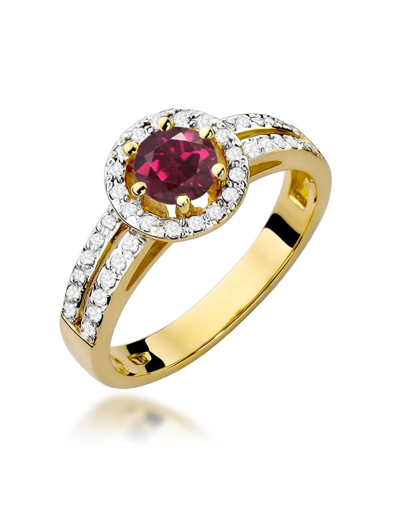 Luksusowy złoty pierścionek z okrągłym rodolitem i 40 brylantami które pięknie go rozświetlają.