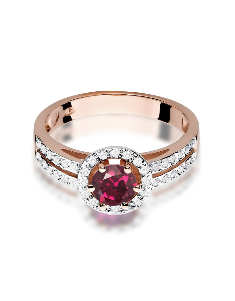Luksusowy złoty pierścionek z okrągłym rodolitem i 40 brylantami które pięknie go rozświetlają.