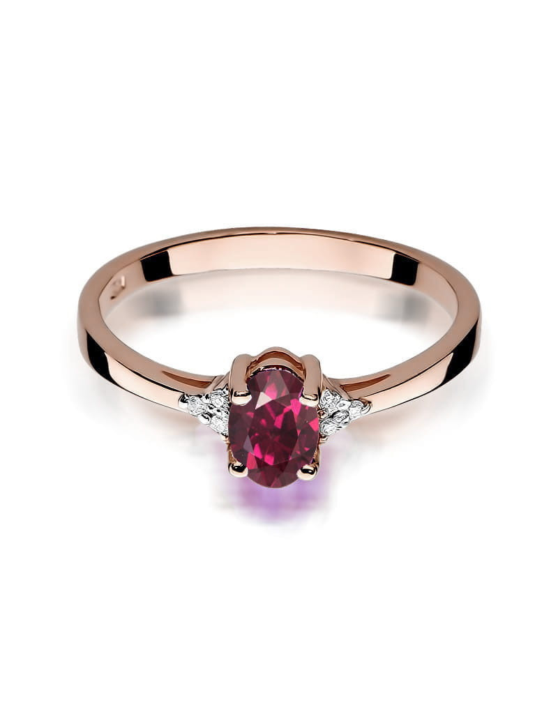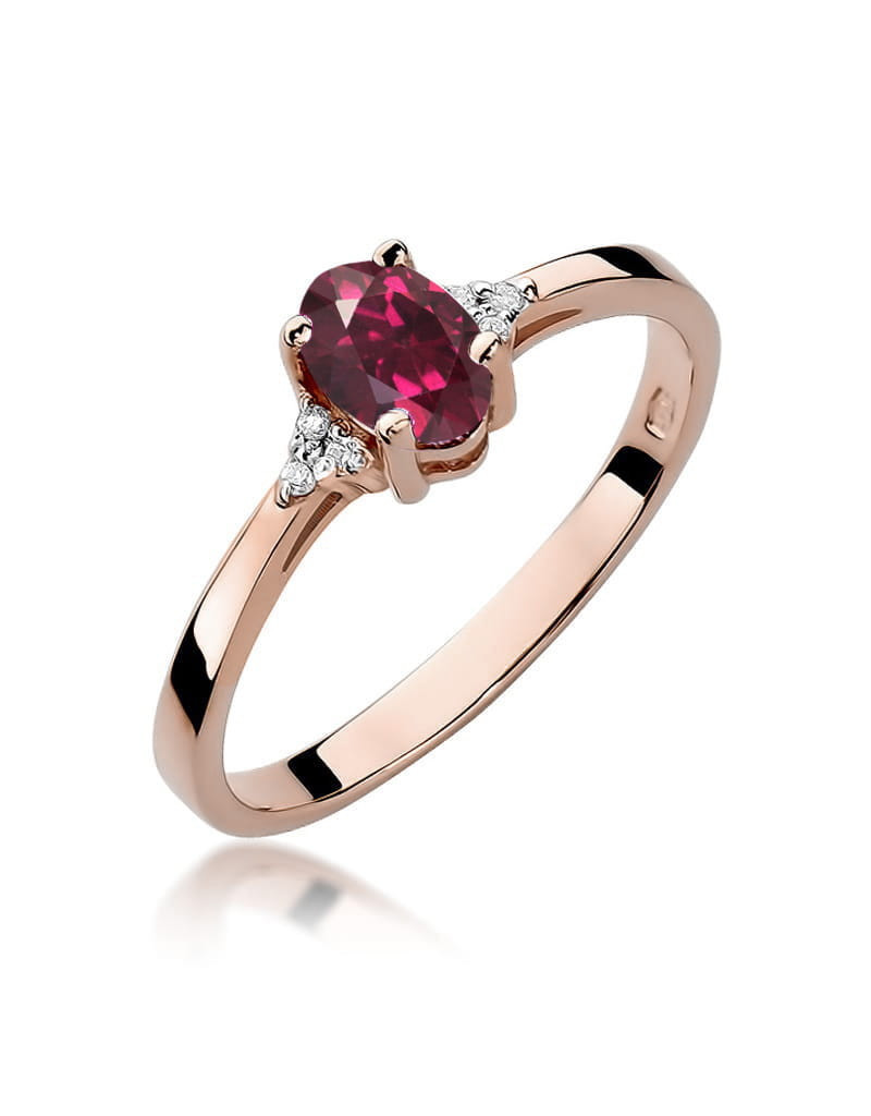 Urzekający pierścionek wykonany z różowego złota z przepięknym rodolitem oraz brylantami, które dodają mu blasku.