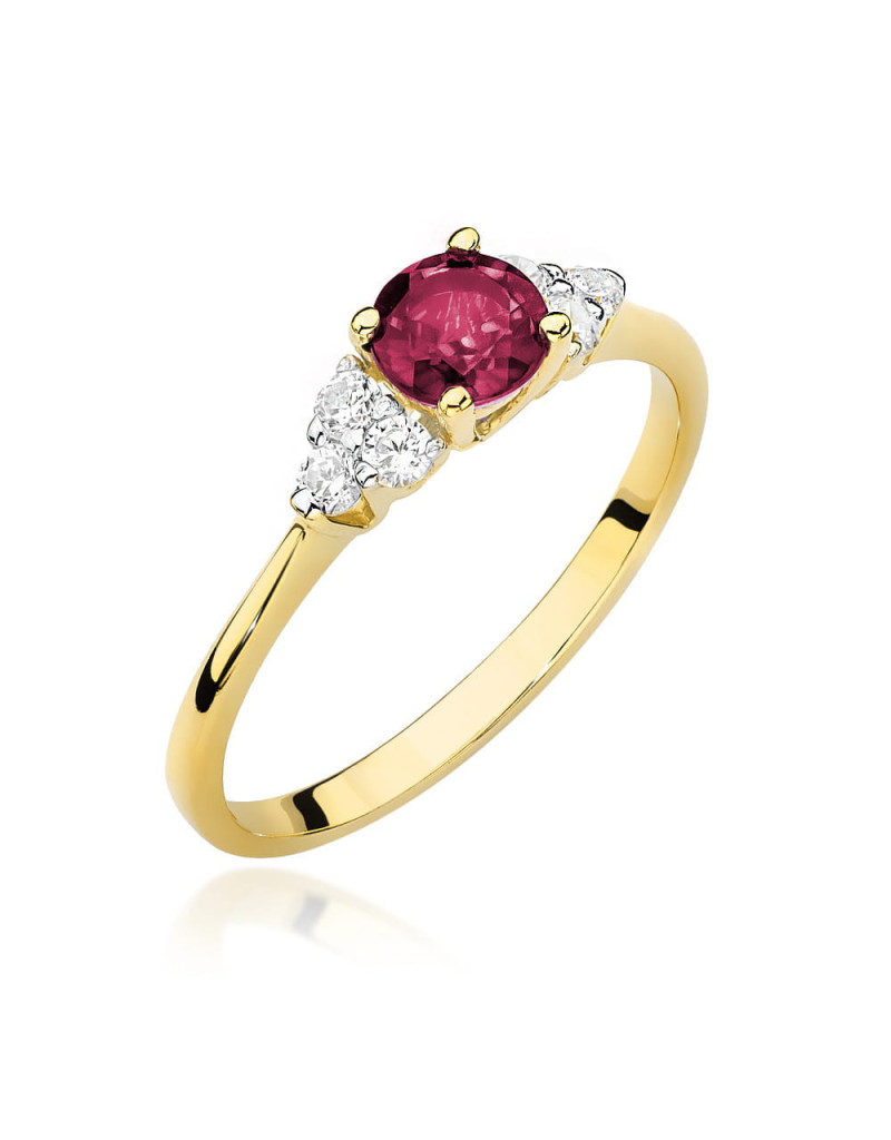 Doskonały wzór pierścionka z brylantami, oraz niezwykłym rubinem. Wykonany z żółtego złota.