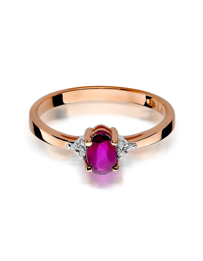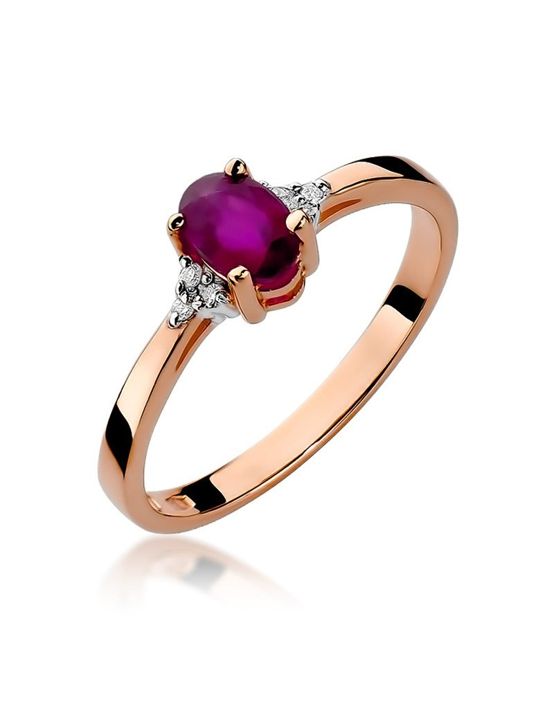 Urzekający pierścionek wykonany z różowego złota z przepięknym rubinem, oraz brylantami które dodają mu blasku.