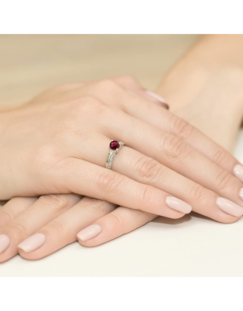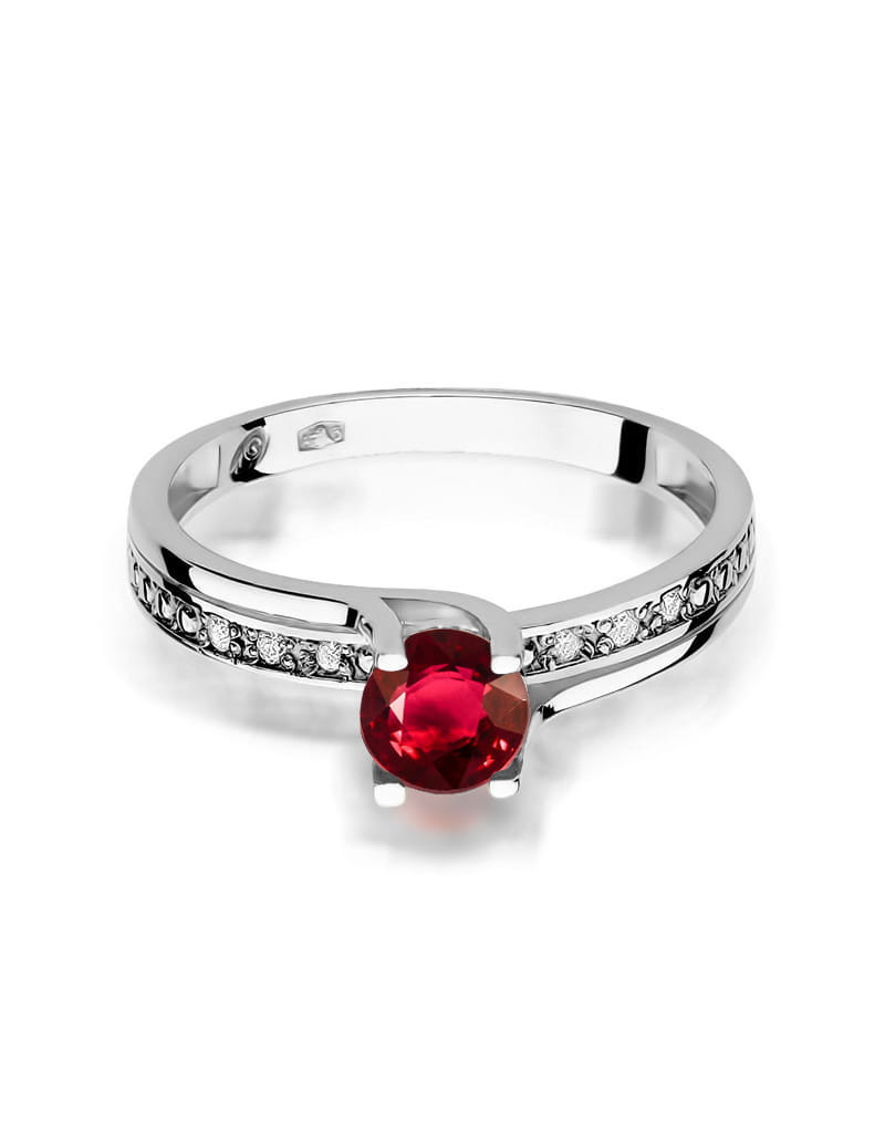 Fantazyjny pierścionek z okrągłym rubinem w czteroramiennej koronie oraz szyną ozdobioną brylantami.