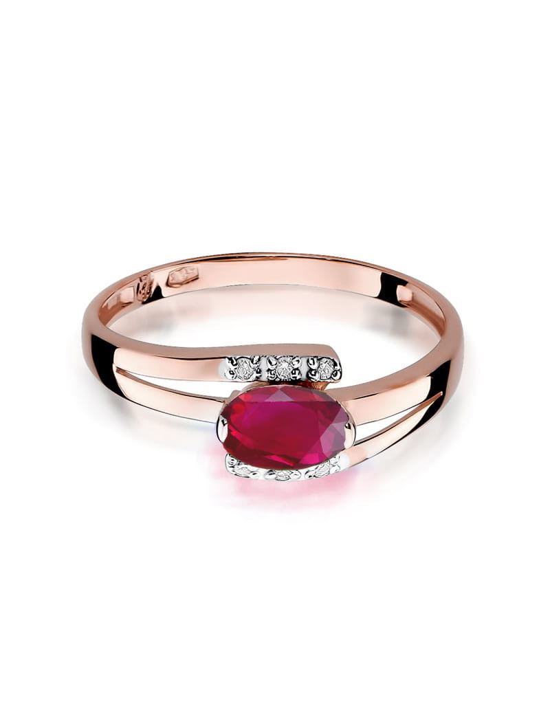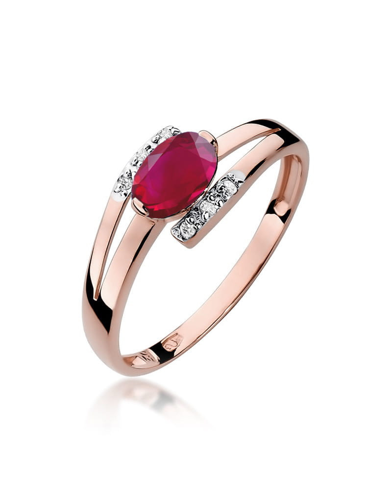 Bajeczny pierścionek z różowego złota z owalnym rubinem, oraz lśniącymi brylantami osadzonymi na wygiętych szynach.