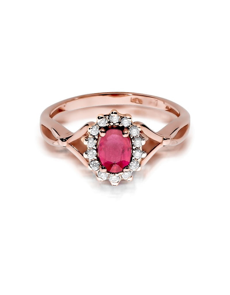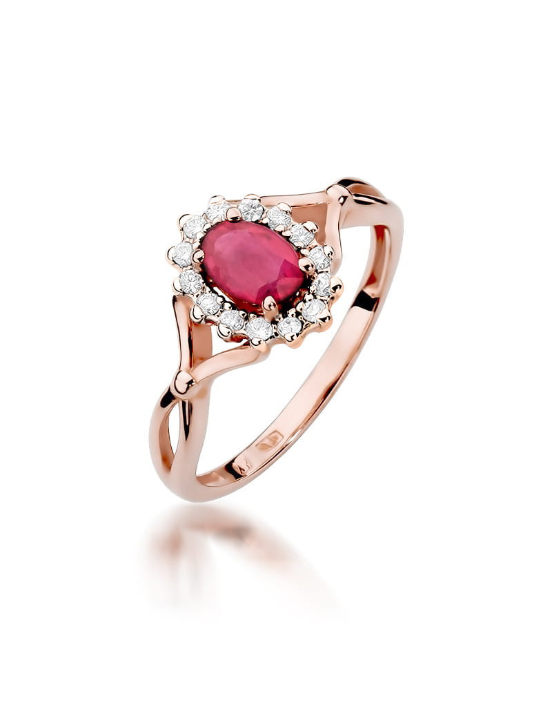 Godny podziwu pierścionek z różowego złota z 14 brylantami dookoła zachwycającego rubinu.
