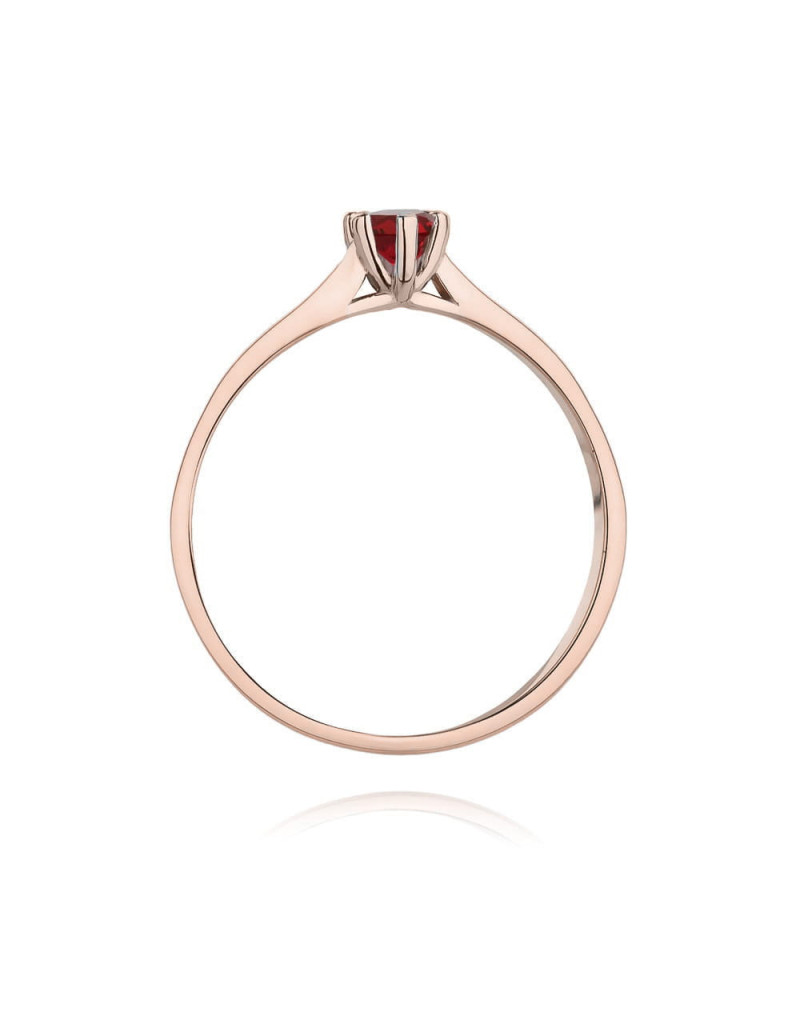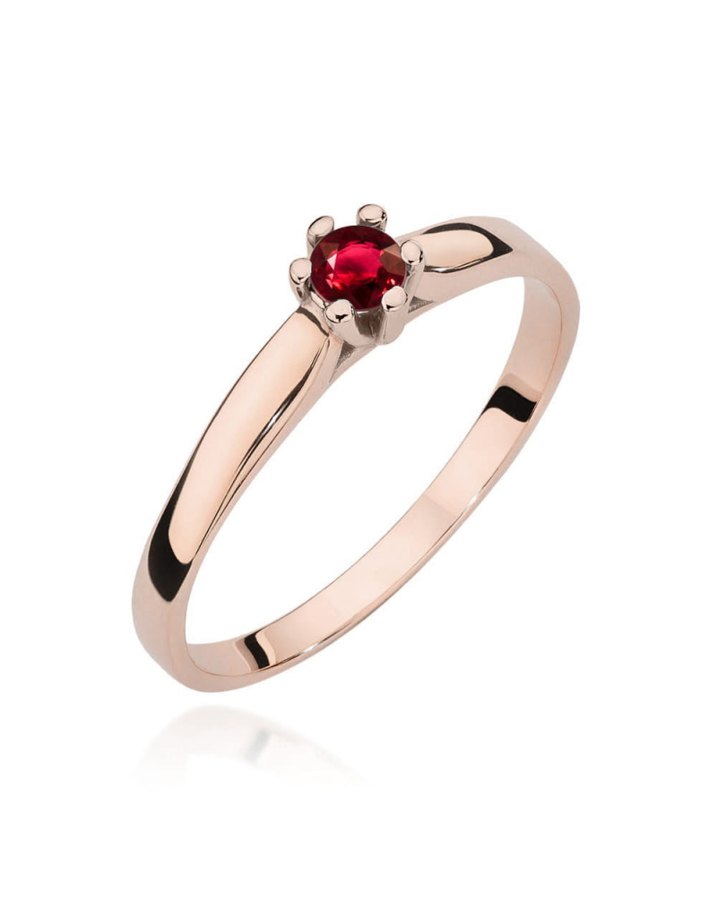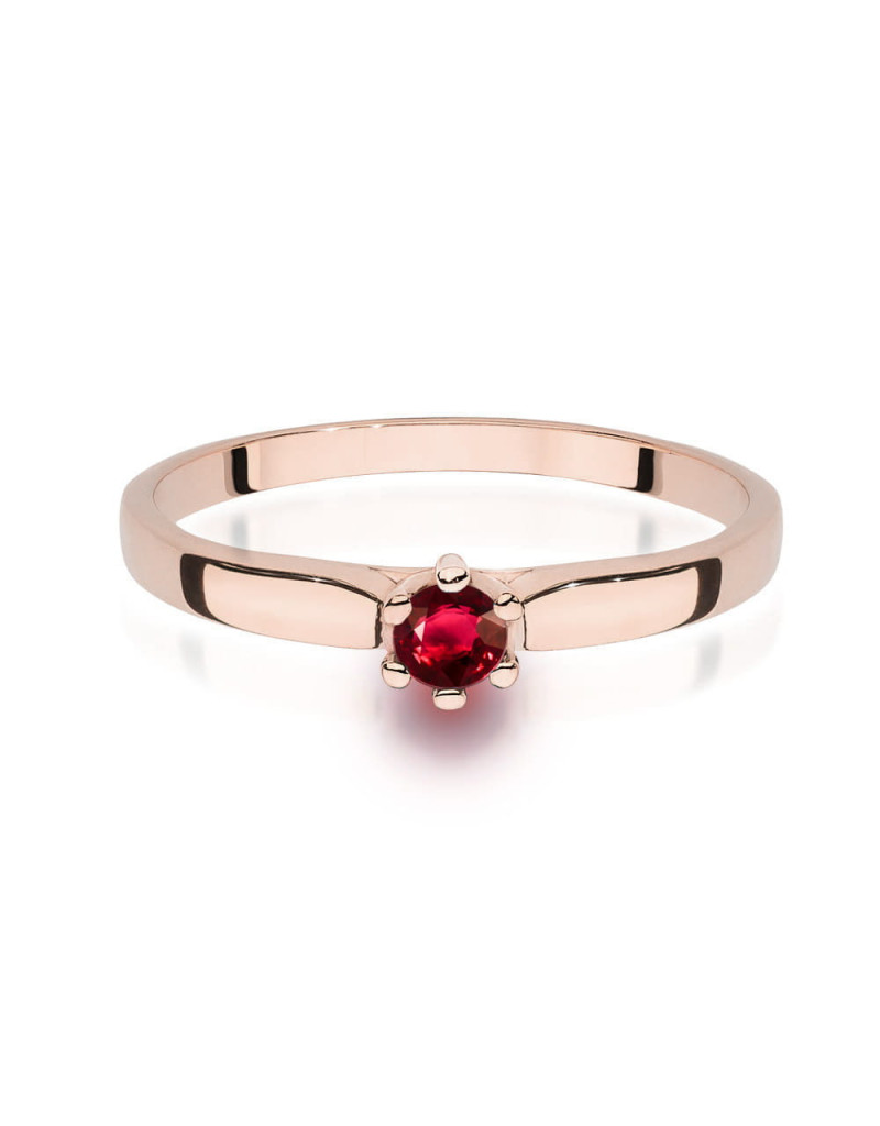 Zjawiskowy pierścionek z różowego złota z okrągłym rubinem w sześcioramiennej oprawie.