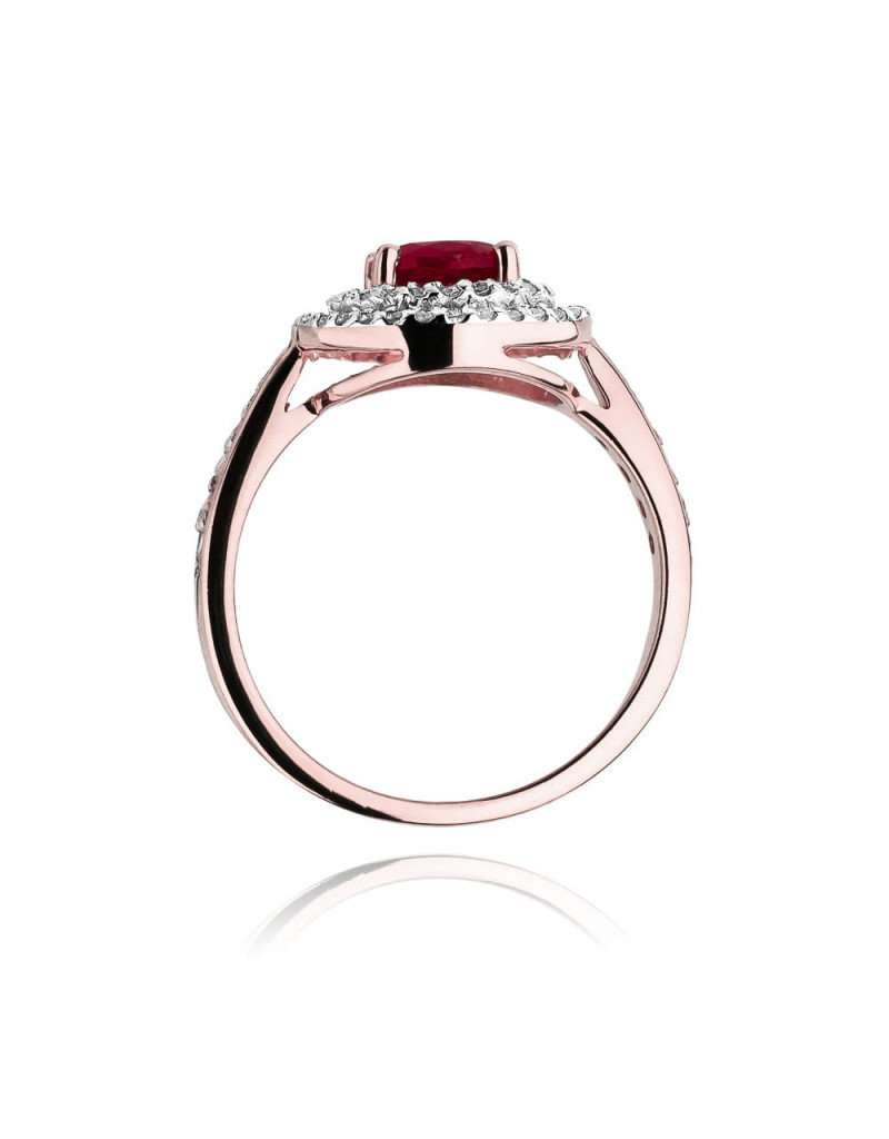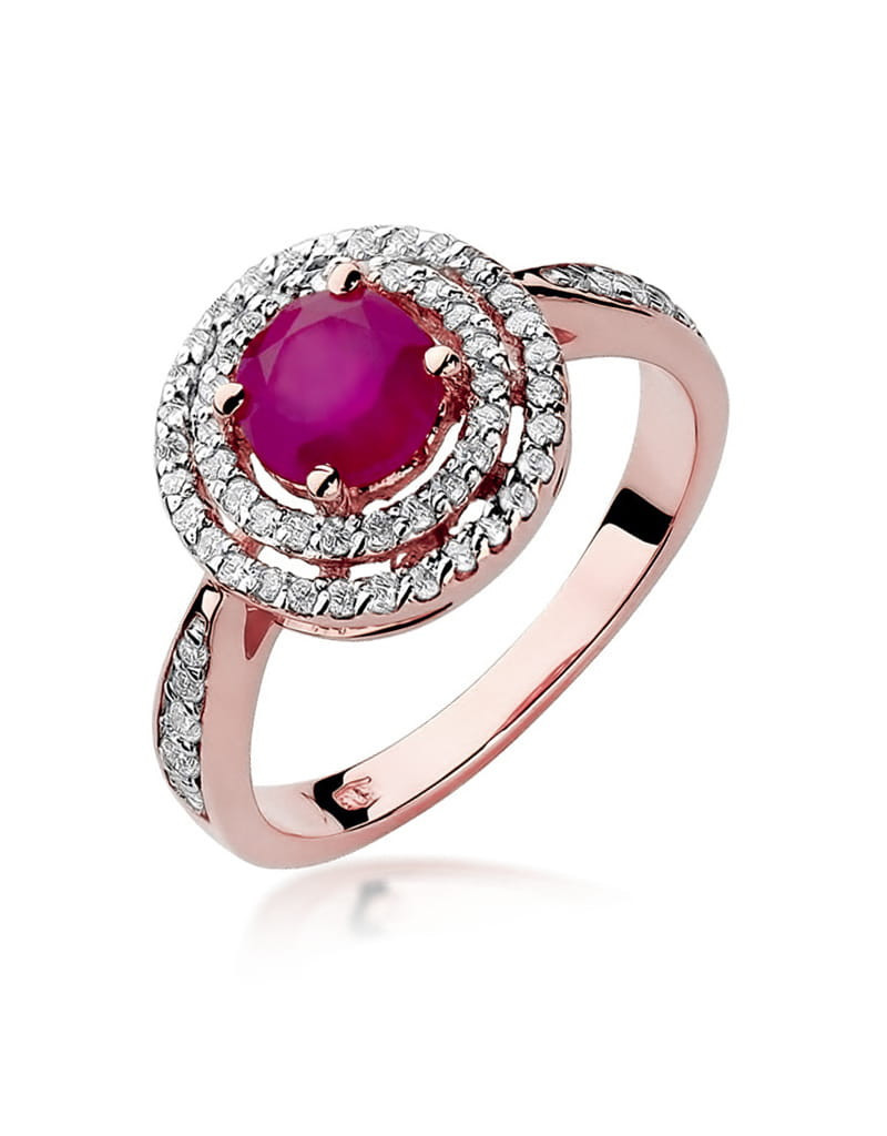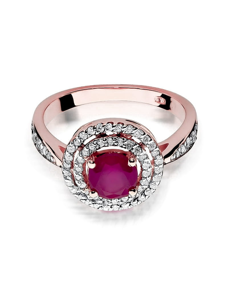 Pełen uroku pierścionek wykonany z różowego złota ze zjawiskowym rubinem i 62 brylantami które dodają mu blasku.