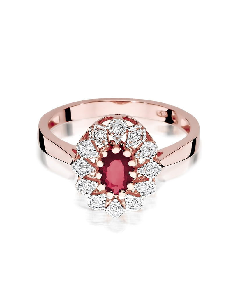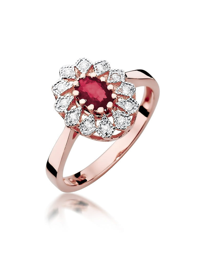 Luksusowy złoty pierścionek z rubinem oprawionym 12 brylantami.