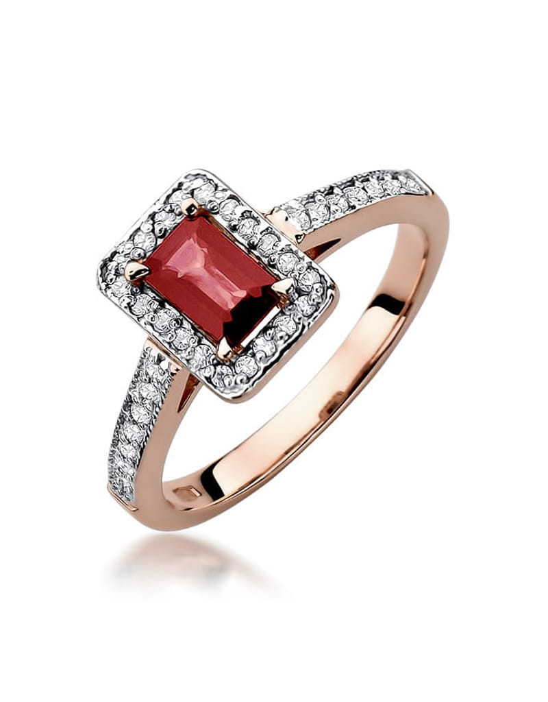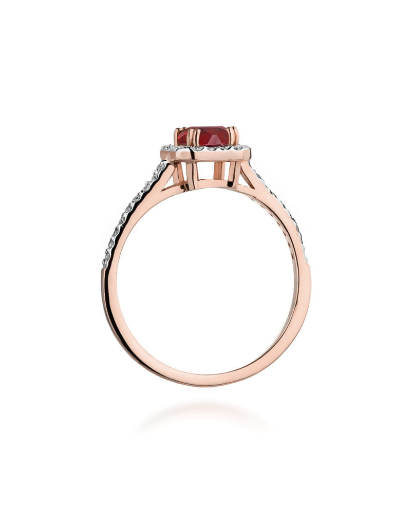 Pierścionek z rubinem i brylantami w różowym złocie, niepowtarzalny wzór, idealnie pasuje na delikatną kobiecą dłoń. Model idealnie łączący tradycje i nowoczesność.