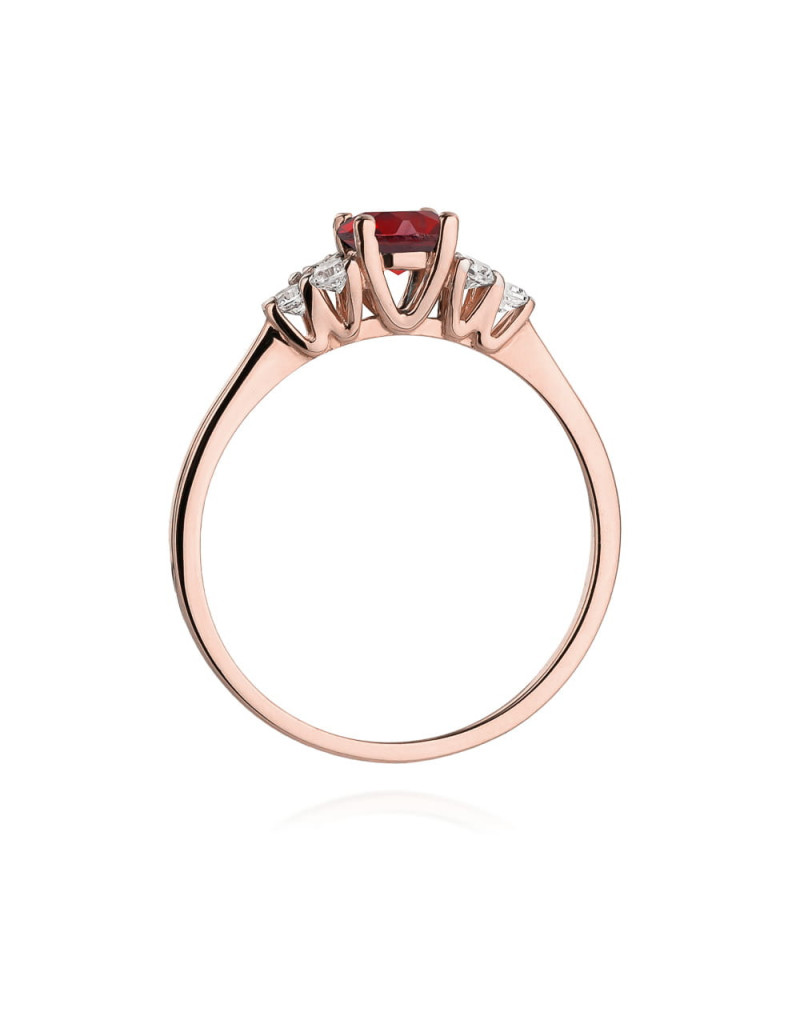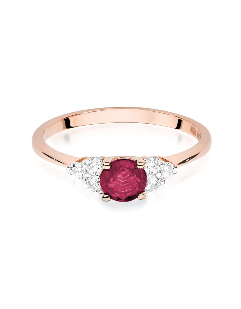 Doskonały wzór pierścionka z brylantami, oraz niezwykłym rubinem. Wykonany z różowego złota.