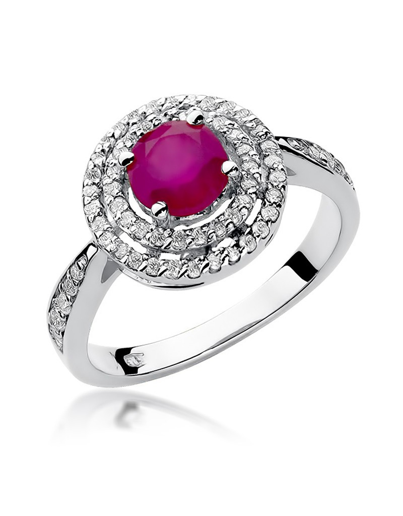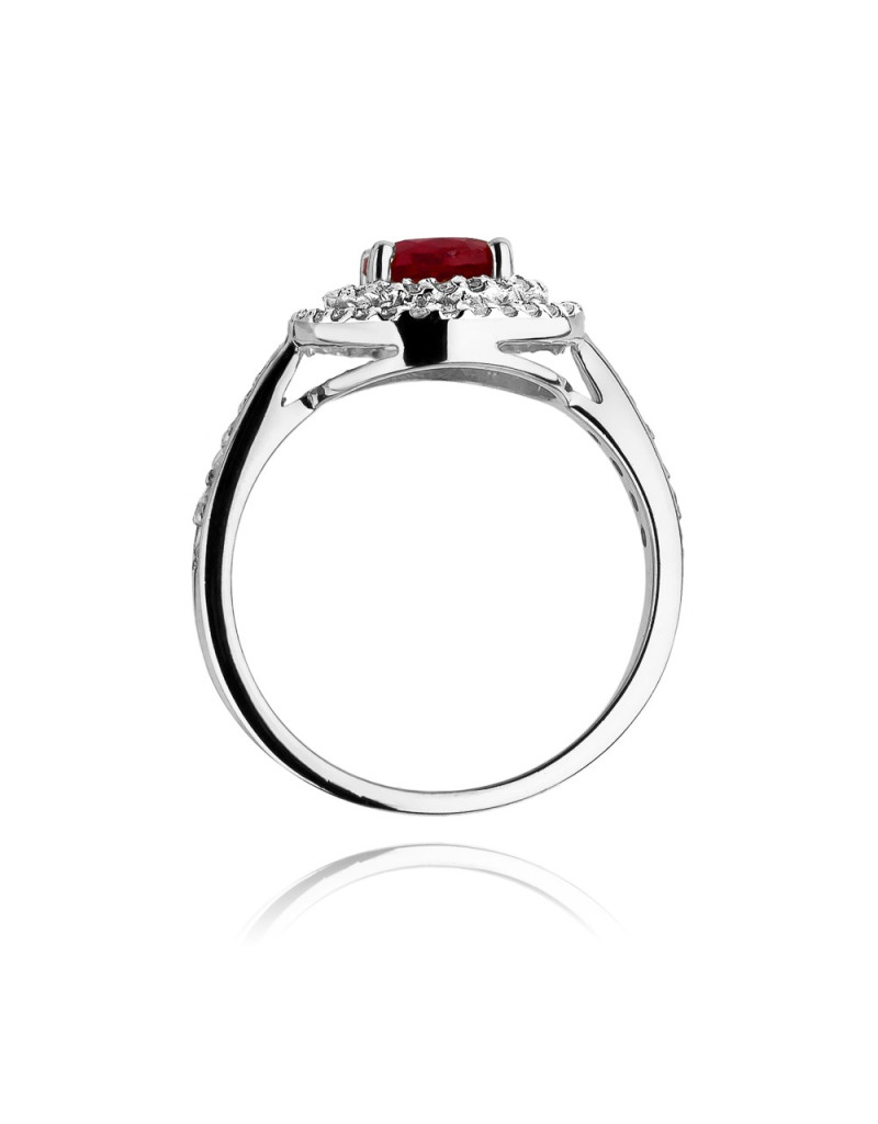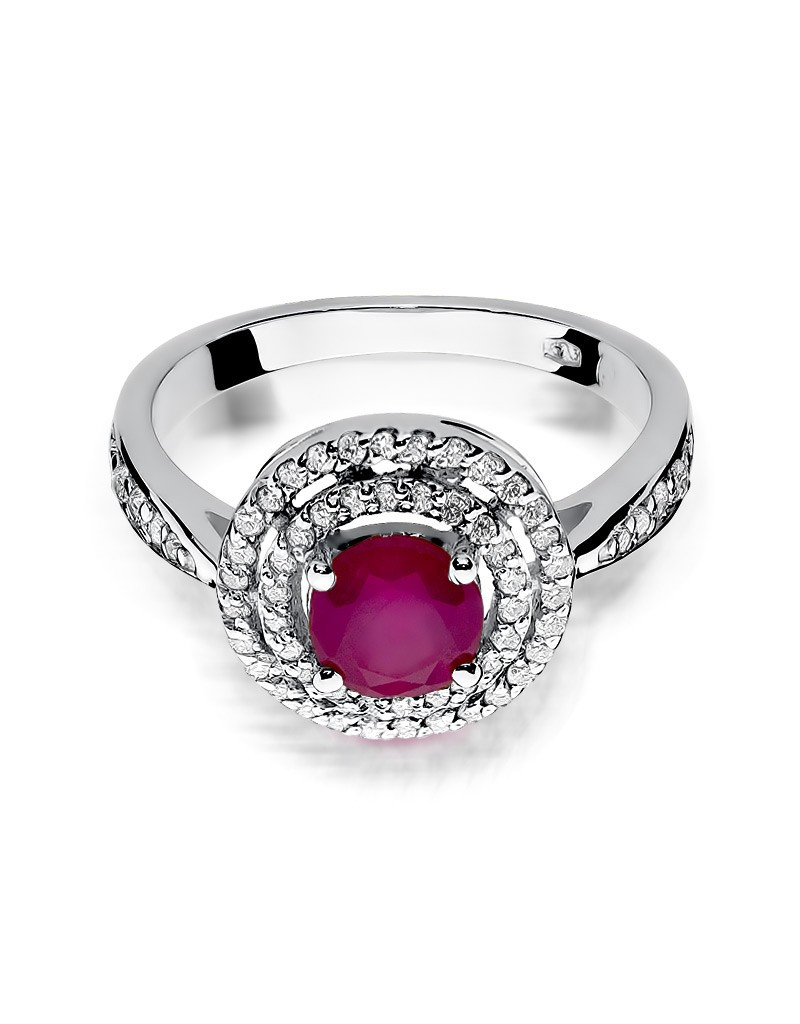 Pełen uroku pierścionek wykonany z białego złota ze zjawiskowym rubinem i 62 brylantami które dodają mu blasku.