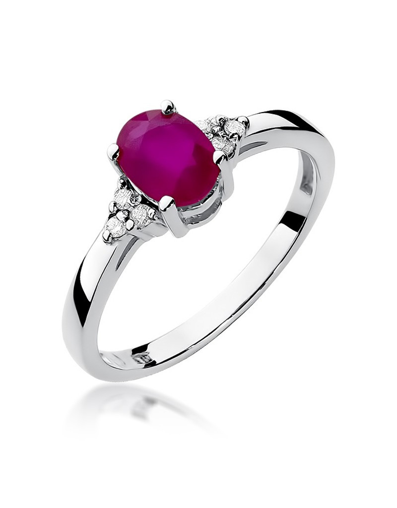 Luksusowy pierścionek z białego złota z owalnym rubinem w wyjątkowej oprawie z 6 brylantami.