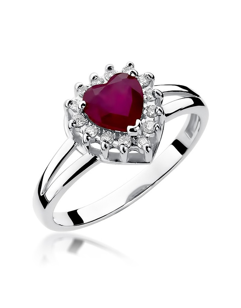 Fantazyjny złoty pierścionek w uroczej oprawie z 14 brylantami zdobiącymi szlachetny rubin w kształcie serca.