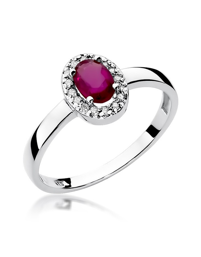 Pełen wdzięku pierścionek z białego złota z unikatowym rubinem ozdobionym brylantami w romantycznej oprawie.