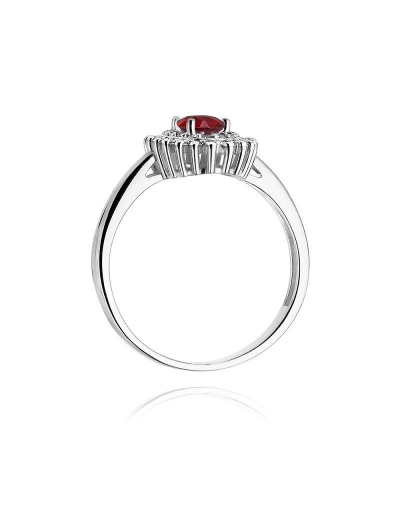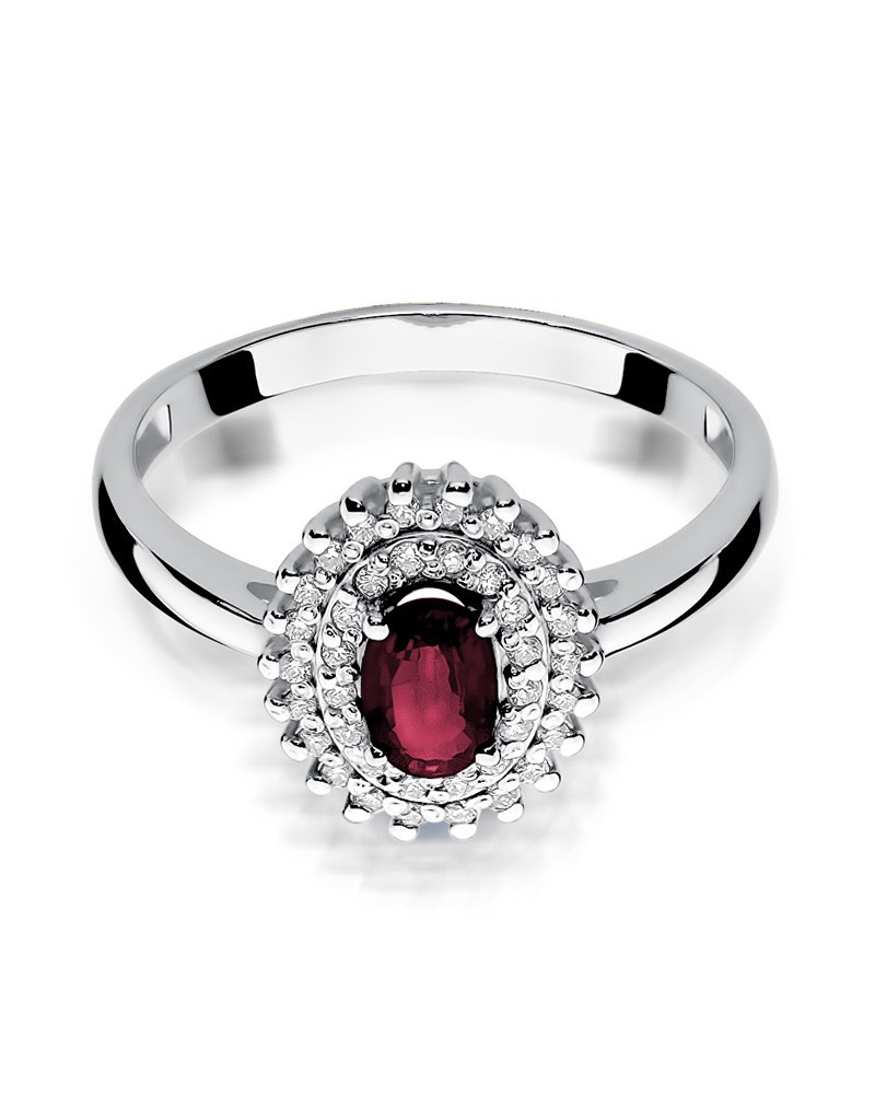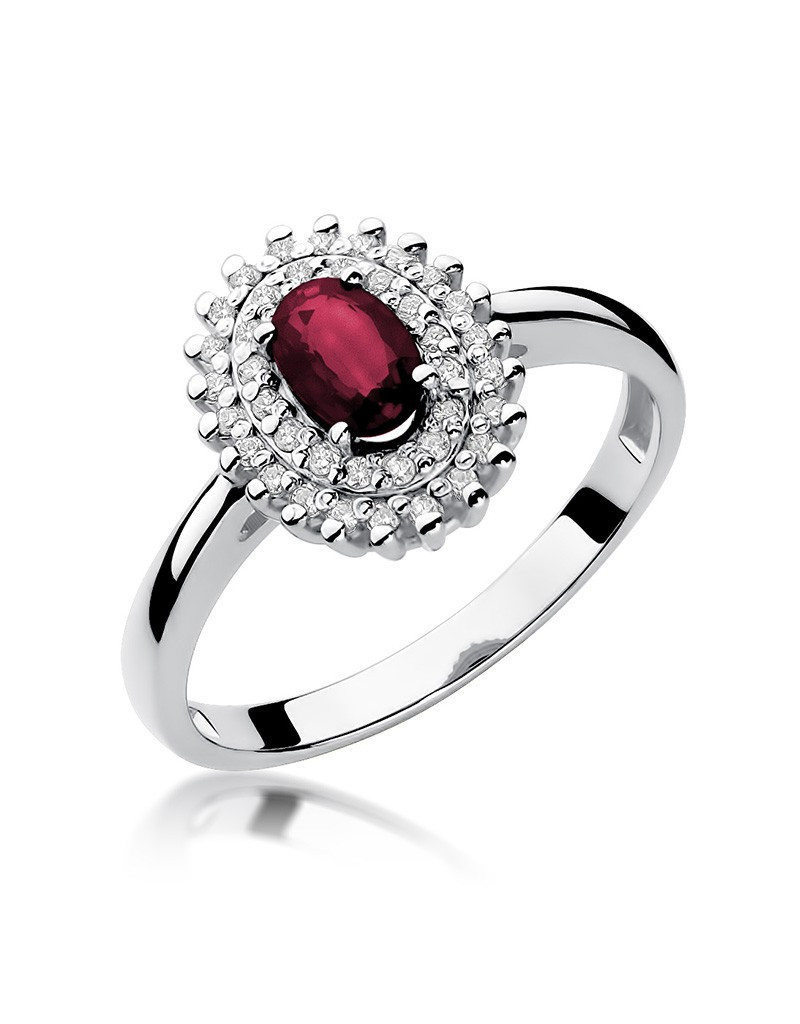 Ponadczasowy pierścionek z białego złota z fascynującym rubinem otoczonym 39 lśniącymi brylantami.