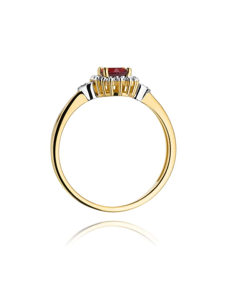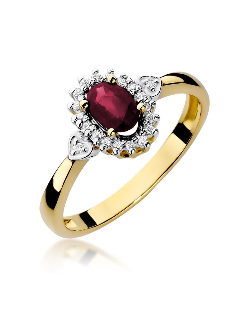 Ponadczasowy wzór złotego pierścionka z unikatowym rubinem w krystalicznej oprawie z 20 brylantami, oraz 2 subtelnymi serduszkami.