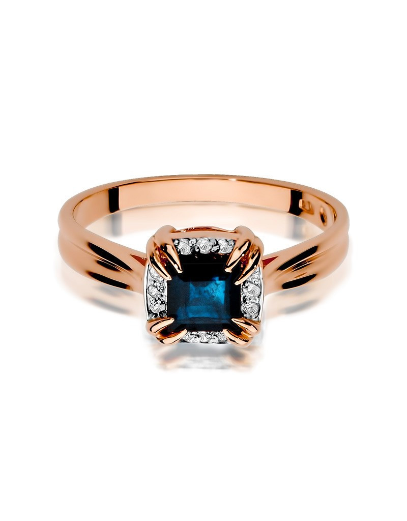 Przepiękny pierścionek z kwadratowym szafirem w oryginalnej czteroramiennej koronie z różowego złota oraz brylantami w niesamowitej oprawie.